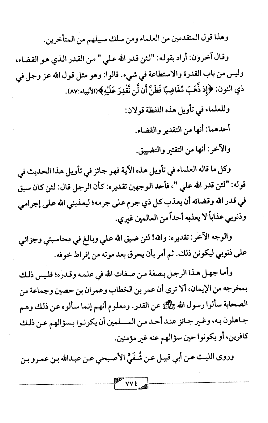 وكل ما قاله العلماء في تأويل هذه الآية فهو جائز في تأويل هذا الحديث في قوله: "لئن قدر الله علي "، فأحد الوجهين تقديره: كأن الرجل قال: لئن كان سبق في قدر الله وقضائه أن يعذب كل ذي جرم على جرمه؛ ليعذبني الله على إجرامي وذنوبي عذاباً لا يعذبه أحداً من العالمين غيري.