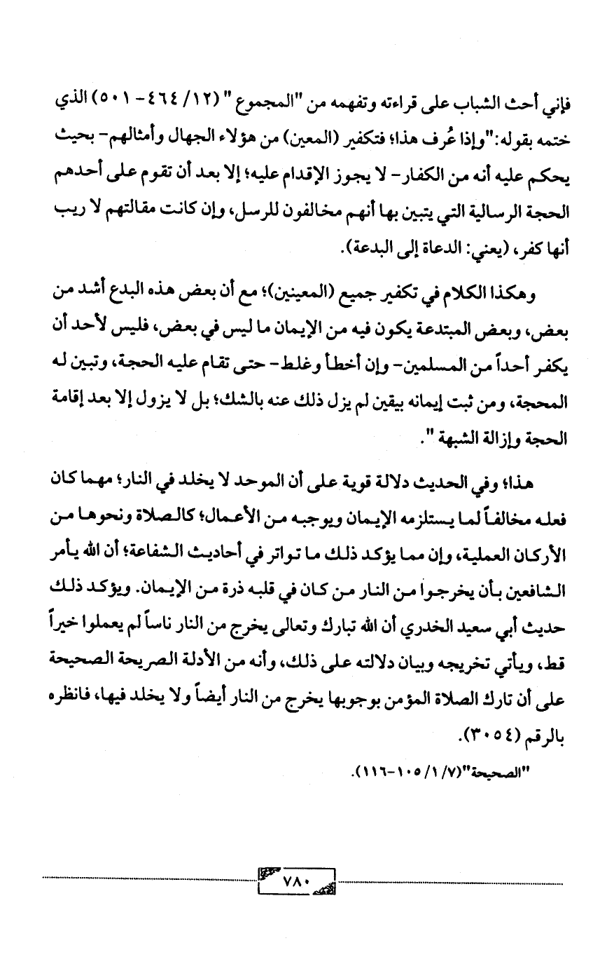 فإني أحث الشباب على قراءته وتفهمه من "المجموع " (12/ 464 - 501) الذي ختمه بقوله:"وإذا عُرف هذا؛ فتكفير (المعين) من هؤلاء الجهال وأمثالهم- بحيث يحكم عليه أنه من الكفار- لا يجوز الإقدام عليه؛ إلا بعد أن تقوم على أحدهم الحجة الرسالية التي يتبين بها أنهم مخالفون للرسل، وإن كانت مقالتهم لا ريب أنها كفر، (يعني: الدعاة إلى البدعة).