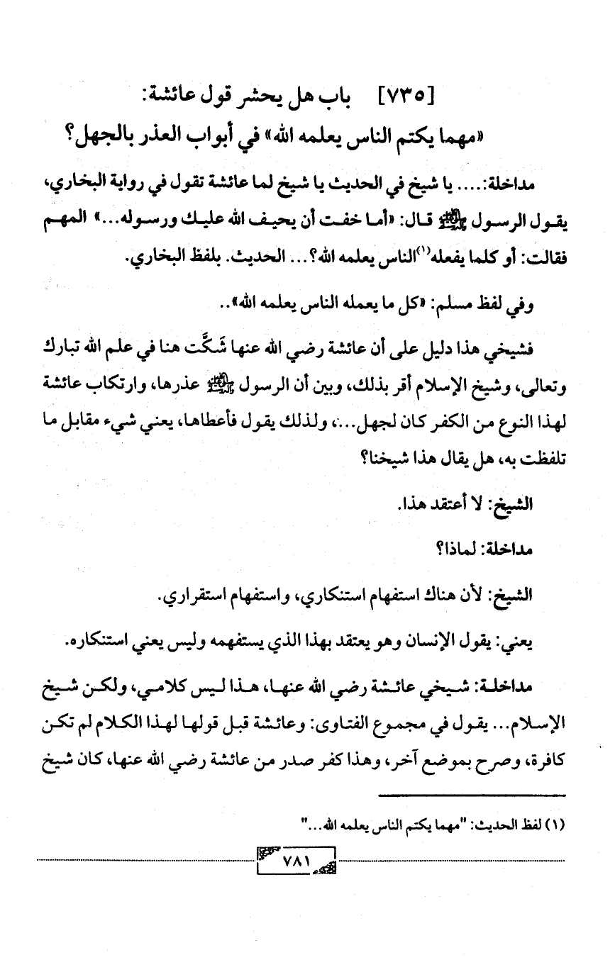 فشيخي هذا دليل على أن عائشة رضي الله عنها شَكَّت هنا في علم الله تبارك وتعالى، وشيخ الإسلام أقر بذلك، وبين أن الرسول - صلى الله عليه وآله وسلم - عذرها، وارتكاب عائشة لهذا النوع من الكفر كان لجهل ... ، ولذلك يقول فأعطاها، يعني شيء مقابل ما تلفظت به، هل يقال هذا شيخنا؟