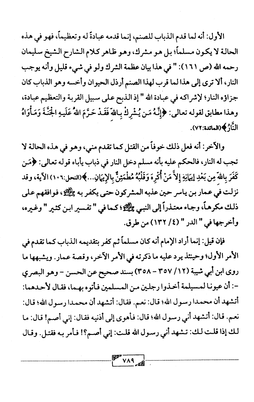 والآخر: أنه فعل ذلك خوفاً من القتل كما تقدم مني، وهو في هذه الحالة لا تجب له النار، فالحكم عليه بأنه مسلم دخل النار في ذباب يأباه قوله تعالى: {مَن كَفَرَ بِاللهِ مِن بَعْدِ إيمَانِهِ إِلاَّ مَنْ أُكْرِهَ وَقَلْبُهُ مُطْمَئِنٌّ بِالإِيمَانِ ... } (النحل:106) الآية، وقد نزلت في عمار بن ياسر حين عذبه المشركون حتى يكفر به - صلى الله عليه وآله وسلم -، فوافقهم على ذلك مكرهاً، وجاء معتذراً إلى النبي - صلى الله عليه وآله وسلم -؛ كما في " تفسير ابن كثير " وغيره، وأخرجها في " الدر " (4/ 132) من طرق.