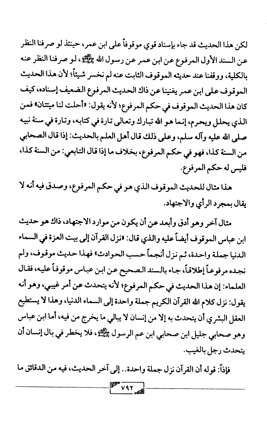مثال آخر وهو أدق وأبعد عن أن يكون من موارد الاجتهاد، ذاك هو حديث ابن عباس الموقوف أيضاً عليه والذي قال: «نزل القرآن إلى بيت العزة في السماء الدنيا جملة واحدة، ثم نزل أنجماً حسب الحوادث» فهذا حديث موقوف، ولم نجده مرفوعاً إطلاقاً، جاء بالسند الصحيح عن ابن عباس موقوفاً عليه، فقال العلماء: إن هذا الحديث في حكم المرفوع؛ لأنه يتحدث عن أمر غيبي، وهو أنه يقول: نزل كلام الله القرآن الكريم جملة واحدة إلى السماء الدنيا، وهذا لا يستطيع العقل البشري أن يتحدث به إلا من إنسان لا يبالي ما يخرج من فيه، أما ابن عباس وهو صحابي جليل ابن صحابي ابن عم الرسول - صلى الله عليه وآله وسلم -، فلا يخطر في بال إنسان أن يتحدث رجل بالغيب.