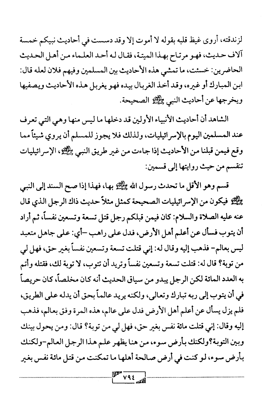 قسم وهو الأقل ما تحدث رسول الله - صلى الله عليه وآله وسلم - بها، فهذا إذا صح السند إلى النبي - صلى الله عليه وآله وسلم - فيكون من الإسرائيليات الصحيحة كمثل مثلاً حديث ذاك الرجل الذي قال عنه عليه الصلاة والسلام: كان فيمن قبلكم رجل قتل تسعة وتسعين نفساً، ثم أراد أن يتوب فسأل عن أعلم أهل الأرض، فدل على راهب -أي: على جاهل متعبد ليس بعالم- فذهب إليه وقال له: إني قتلت تسعة وتسعين نفساً بغير حق، فهل لي من توبة؟ قال له: قتلت تسعة وتسعين نفساً وتريد أن تتوب، لا توبة لك، فقتله وأتم به العدد المائة لكن الرجل يبدو من سياق الحديث أنه كان مخلصاً، كان حريصاً في أن يتوب إلى ربه تبارك وتعالى، ولكنه يريد عالماً بحق أن يدله على الطريق، فلم يزل يسأل عن أعلم أهل الأرض فدل على عالم، هذه المرة وفق بعالم، فذهب إليه وقال: إني قتلت مائة نفس بغير حق، فهل لي من توبة؟ قال: ومن يحول بينك وبين التوبة؟ ولكنك بأرض سوء، من هنا يظهر علم هذا الرجل العالم-ولكنك بأرض سوء، لو كنت في أرض صالحة أهلها ما تمكنت من قتل مائة نفس بغير