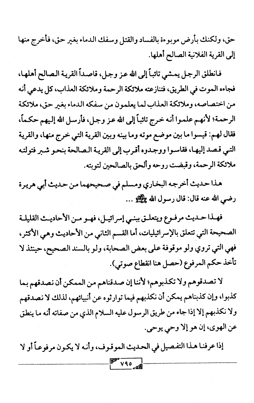 فهذا حديث مرفوع ويتعلق ببني إسرائيل، فهو من الأحاديث القليلة الصحيحة التي تتعلق بالإسرائيليات، أما القسم الثاني من الأحاديث وهي الأكثر، فهي التي تروي ولو موقوفة على بعض الصحابة، ولو بالسند الصحيح، حينئذ لا تأخذ حكم المرفوع (حصل هنا انقطاع صوتي).