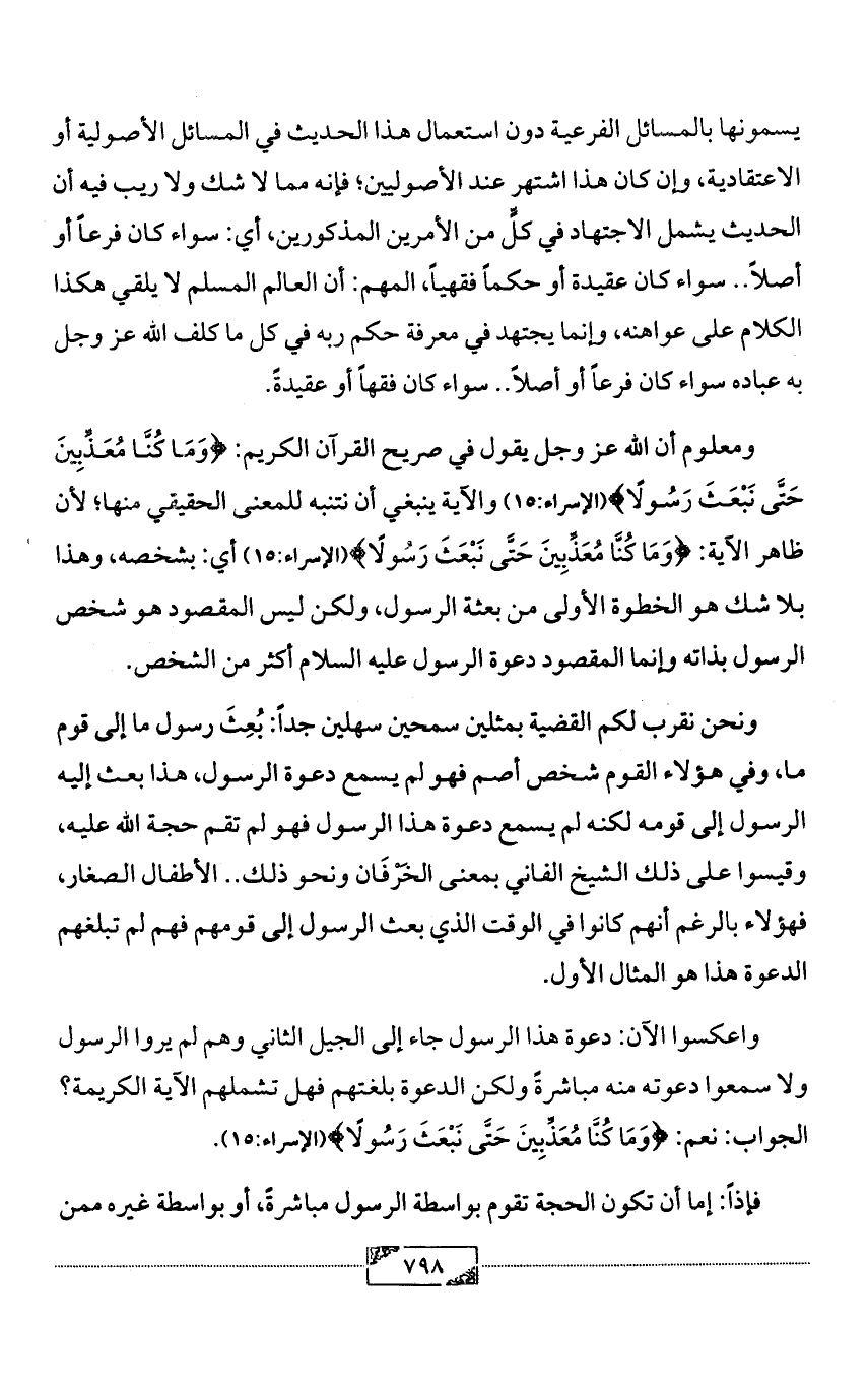 ومعلوم أن الله عز وجل يقول في صريح القرآن الكريم: {وَمَا كُنَّا مُعَذِّبِينَ حَتَّى نَبْعَثَ رَسُولًا} (الإسراء:15) والآية ينبغي أن نتنبه للمعنى الحقيقي منها؛ لأن ظاهر الآية: {وَمَا كُنَّا مُعَذِّبِينَ حَتَّى نَبْعَثَ رَسُولًا} (الإسراء:15) أي: بشخصه، وهذا بلا شك هو الخطوة الأولى من بعثة الرسول، ولكن ليس المقصود هو شخص الرسول بذاته وإنما المقصود دعوة الرسول عليه السلام أكثر من الشخص.