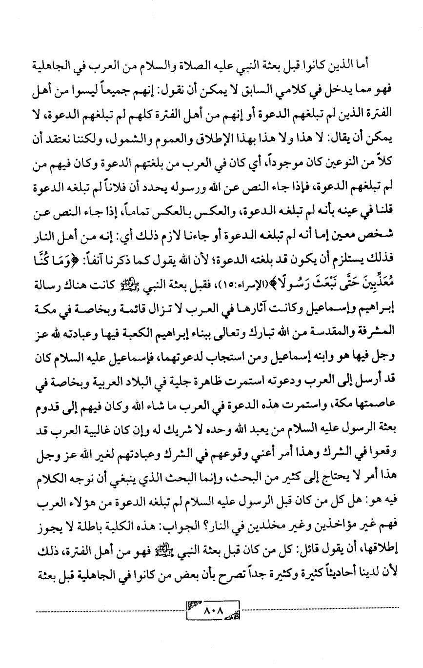 أما الذين كانوا قبل بعثة النبي عليه الصلاة والسلام من العرب في الجاهلية فهو مما يدخل في كلامي السابق لا يمكن أن نقول: إنهم جميعاً ليسوا من أهل الفترة الذين لم تبلغهم الدعوة أو إنهم من أهل الفترة كلهم لم تبلغهم الدعوة، لا يمكن أن يقال: لا هذا ولا هذا بهذا الإطلاق والعموم والشمول، ولكننا نعتقد أن كلاً من النوعين كان موجوداً، أي كان في العرب من بلغتهم الدعوة وكان فيهم من لم تبلغهم الدعوة، فإذا جاء النص عن الله ورسوله يحدد أن فلاناً لم تبلغه الدعوة قلنا في عينه بأنه لم تبلغه الدعوة، والعكس بالعكس تماماً، إذا جاء النص عن شخص معين إما أنه لم تبلغه الدعوة أو جاءنا لازم ذلك أي: إنه من أهل النار فذلك يستلزم أن يكون قد بلغته الدعوة؛ لأن الله يقول كما ذكرنا آنفاً: {وَمَا كُنَّا مُعَذِّبِينَ حَتَّى نَبْعَثَ رَسُولًا} (الإسراء:15)، فقبل بعثة النبي - صلى الله عليه وآله وسلم - كانت هناك رسالة إبراهيم وإسماعيل وكانت آثارها في العرب لا تزال قائمة وبخاصة في مكة المشرفة والمقدسة من الله تبارك وتعالى ببناء إبراهيم الكعبة فيها وعبادته لله عز وجل فيها هو وابنه إسماعيل ومن استجاب لدعوتهما، فإسماعيل عليه السلام كان قد أرسل إلى العرب ودعوته استمرت ظاهرة جلية في البلاد العربية وبخاصة في عاصمتها مكة، واستمرت هذه الدعوة في العرب ما شاء الله وكان فيهم إلى قدوم بعثة الرسول عليه السلام من يعبد الله وحده لا شريك له وإن كان غالبية العرب قد وقعوا في الشرك وهذا أمر أعني وقوعهم في الشرك وعبادتهم لغير الله عز وجل هذا أمر لا يحتاج إلى كثير من البحث، وإنما البحث الذي ينبغي أن نوجه الكلام فيه هو: هل كل من كان قبل الرسول عليه السلام لم تبلغه الدعوة من هؤلاء العرب فهم غير مؤاخذين وغير مخلدين في النار؟ الجواب: هذه الكلية باطلة لا يجوز إطلاقها، أن يقول قائل: كل من كان قبل بعثة النبي - صلى الله عليه وآله وسلم - فهو من أهل الفترة، ذلك لأن لدينا أحاديثاً كثيرة وكثيرة جداً تصرح بأن بعض من كانوا في الجاهلية قبل بعثة