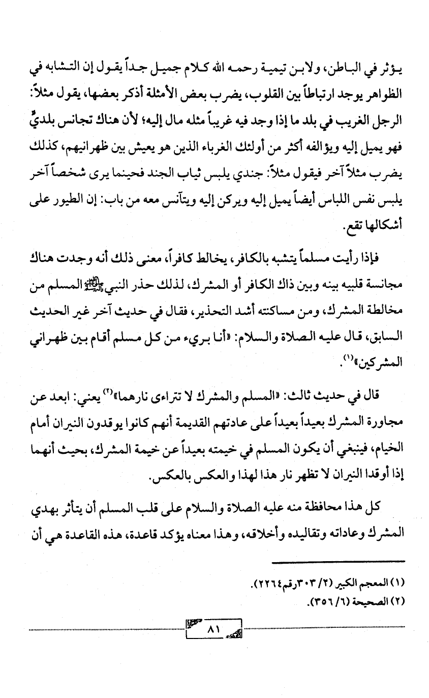 فإذا رأيت مسلماً يتشبه بالكافر، يخالط كافراً، معنى ذلك أنه وجدت هناك مجانسة قلبيه بينه وبين ذاك الكافر أو المشرك، لذلك حذر النبي - صلى الله عليه وآله وسلم - المسلم من مخالطة المشرك، ومن مساكنته أشد التحذير، فقال في حديث آخر غير الحديث السابق، قال عليه الصلاة والسلام: «أنا بريء من كل مسلم أقام بين ظهراني المشركين» (¬1).