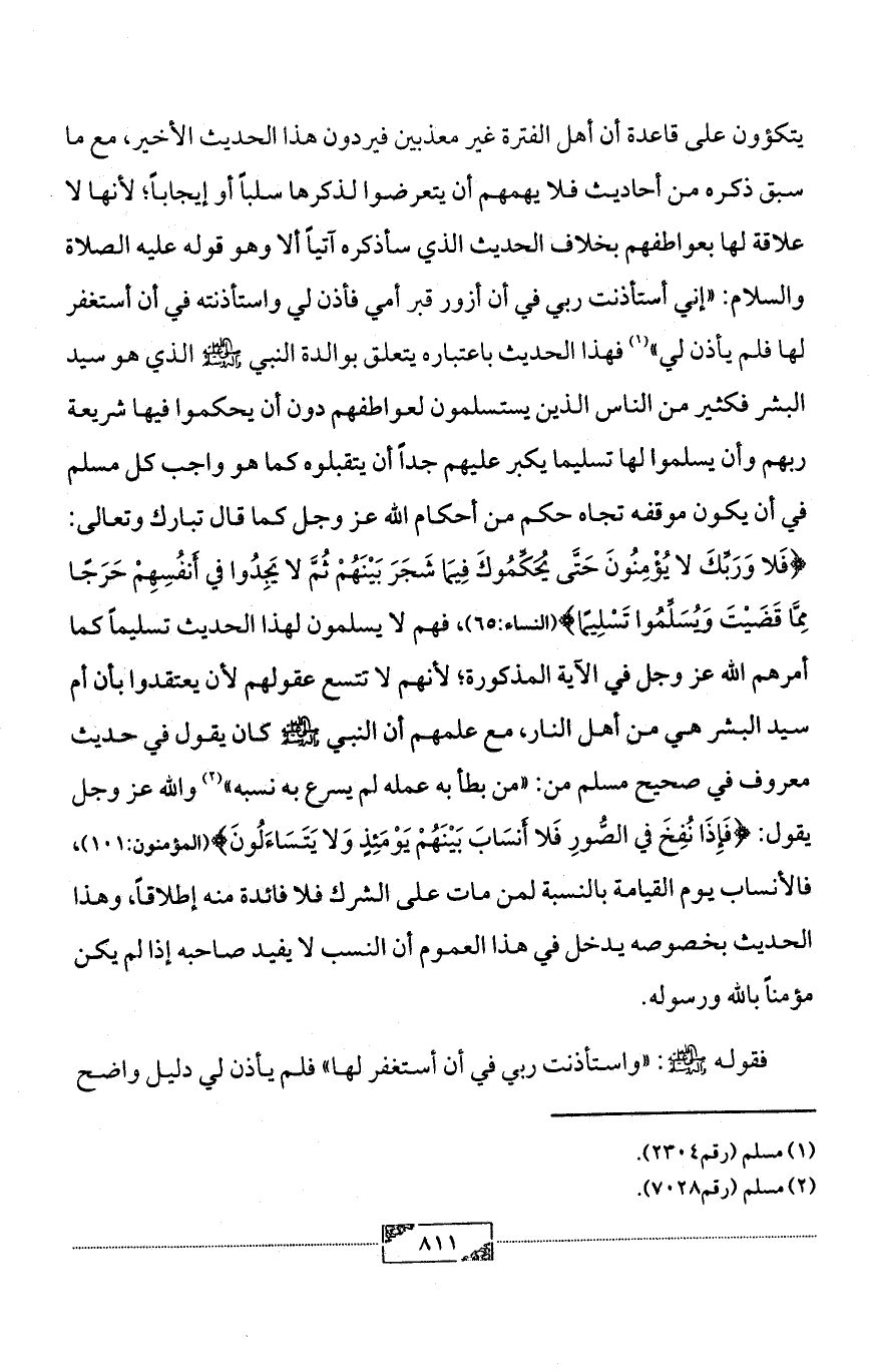 يتكؤون على قاعدة أن أهل الفترة غير معذبين فيردون هذا الحديث الأخير، مع ما سبق ذكره من أحاديث فلا يهمهم أن يتعرضوا لذكرها سلباً أو إيجاباً؛ لأنها لا علاقة لها بعواطفهم بخلاف الحديث الذي سأذكره آتياً ألا وهو قوله عليه الصلاة والسلام: «إني أستأذنت ربي في أن أزور قبر أمي فأذن لي واستأذنته في أن أستغفر لها فلم يأذن لي» (¬1) فهذا الحديث باعتباره يتعلق بوالدة النبي - صلى الله عليه وآله وسلم - الذي هو سيد البشر فكثير من الناس الذين يستسلمون لعواطفهم دون أن يحكموا فيها شريعة ربهم وأن يسلموا لها تسليما يكبر عليهم جداً أن يتقبلوه كما هو واجب كل مسلم في أن يكون موقفه تجاه حكم من أحكام الله عز وجل كما قال تبارك وتعالى: {فَلا وَرَبِّكَ لا يُؤْمِنُونَ حَتَّى يُحَكِّمُوكَ فِيمَا شَجَرَ بَيْنَهُمْ ثُمَّ لا يَجِدُوا في أَنفُسِهِمْ حَرَجًا مِمَّا قَضَيْتَ وَيُسَلِّمُوا تَسْلِيمًا} (النساء:65)، فهم لا يسلمون لهذا الحديث تسليماً كما أمرهم الله عز وجل في الآية المذكورة؛ لأنهم لا تتسع عقولهم لأن يعتقدوا بأن أم سيد البشر هي من أهل النار، مع علمهم أن النبي - صلى الله عليه وآله وسلم - كان يقول في حديث معروف في صحيح مسلم من: «من بطأ به عمله لم يسرع به نسبه» (¬2) والله عز وجل يقول: {فَإِذَا نُفِخَ في الصُّورِ فَلا أَنسَابَ بَيْنَهُمْ يَوْمَئِذٍ وَلا يَتَسَاءَلُونَ} (المؤمنون:101)، فالأنساب يوم القيامة بالنسبة لمن مات على الشرك فلا فائدة منه إطلاقاً، وهذا الحديث بخصوصه يدخل في هذا العموم أن النسب لا يفيد صاحبه إذا لم يكن مؤمناً بالله ورسوله.