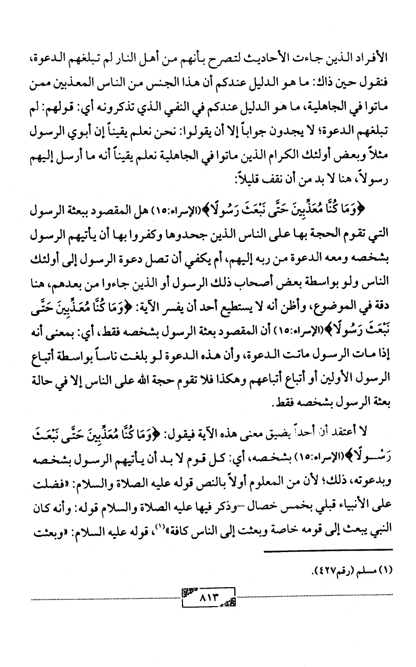 {وَمَا كُنَّا مُعَذِّبِينَ حَتَّى نَبْعَثَ رَسُولًا} (الإسراء:15) هل المقصود ببعثة الرسول التي تقوم الحجة بها على الناس الذين جحدوها وكفروا بها أن يأتيهم الرسول بشخصه ومعه الدعوة من ربه إليهم، أم يكفي أن تصل دعوة الرسول إلى أولئك الناس ولو بواسطة بعض أصحاب ذلك الرسول أو الذين جاءوا من بعدهم، هنا دقة في الموضوع، وأظن أنه لا يستطيع أحد أن يفسر الآية: {وَمَا كُنَّا مُعَذِّبِينَ حَتَّى نَبْعَثَ رَسُولًا} (الإسراء:15) أن المقصود بعثة الرسول بشخصه فقط، أي: بمعنى أنه إذا مات الرسول ماتت الدعوة، وأن هذه الدعوة لو بلغت ناساً بواسطة أتباع الرسول الأولين أو أتباع أتباعهم وهكذا فلا تقوم حجة الله على الناس إلا في حالة بعثة الرسول بشخصه فقط.