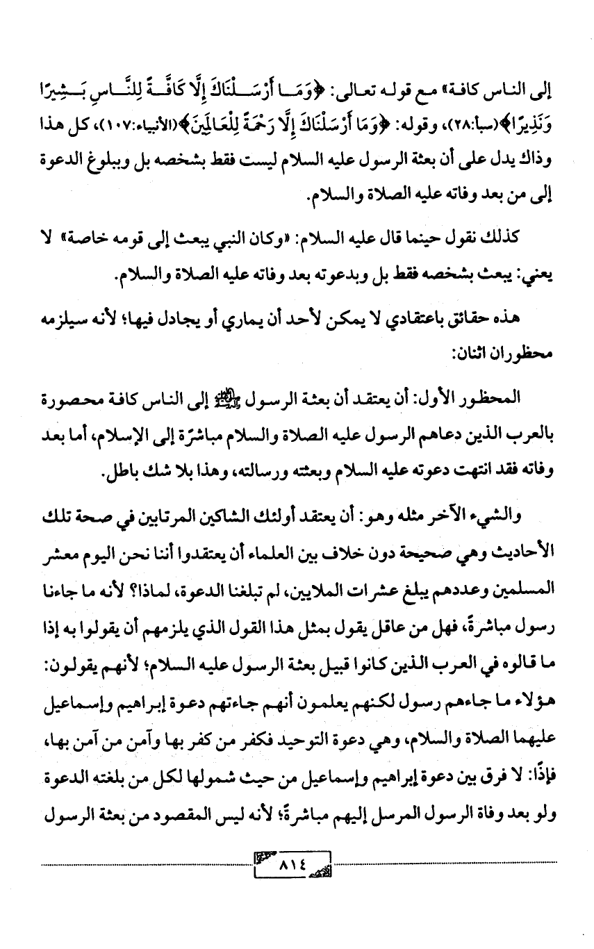 إلى الناس كافة» مع قوله تعالى: {وَمَا أَرْسَلْنَاكَ إِلَّا كَافَّةً لِلنَّاسِ بَشِيرًا وَنَذِيرًا} (سبأ:28)، وقوله: {وَمَا أَرْسَلْنَاكَ إِلَّا رَحْمَةً لِلْعَالَمِينَ} (الأنبياء:107)، كل هذا وذاك يدل على أن بعثة الرسول عليه السلام ليست فقط بشخصه بل وببلوغ الدعوة إلى من بعد وفاته عليه الصلاة والسلام.