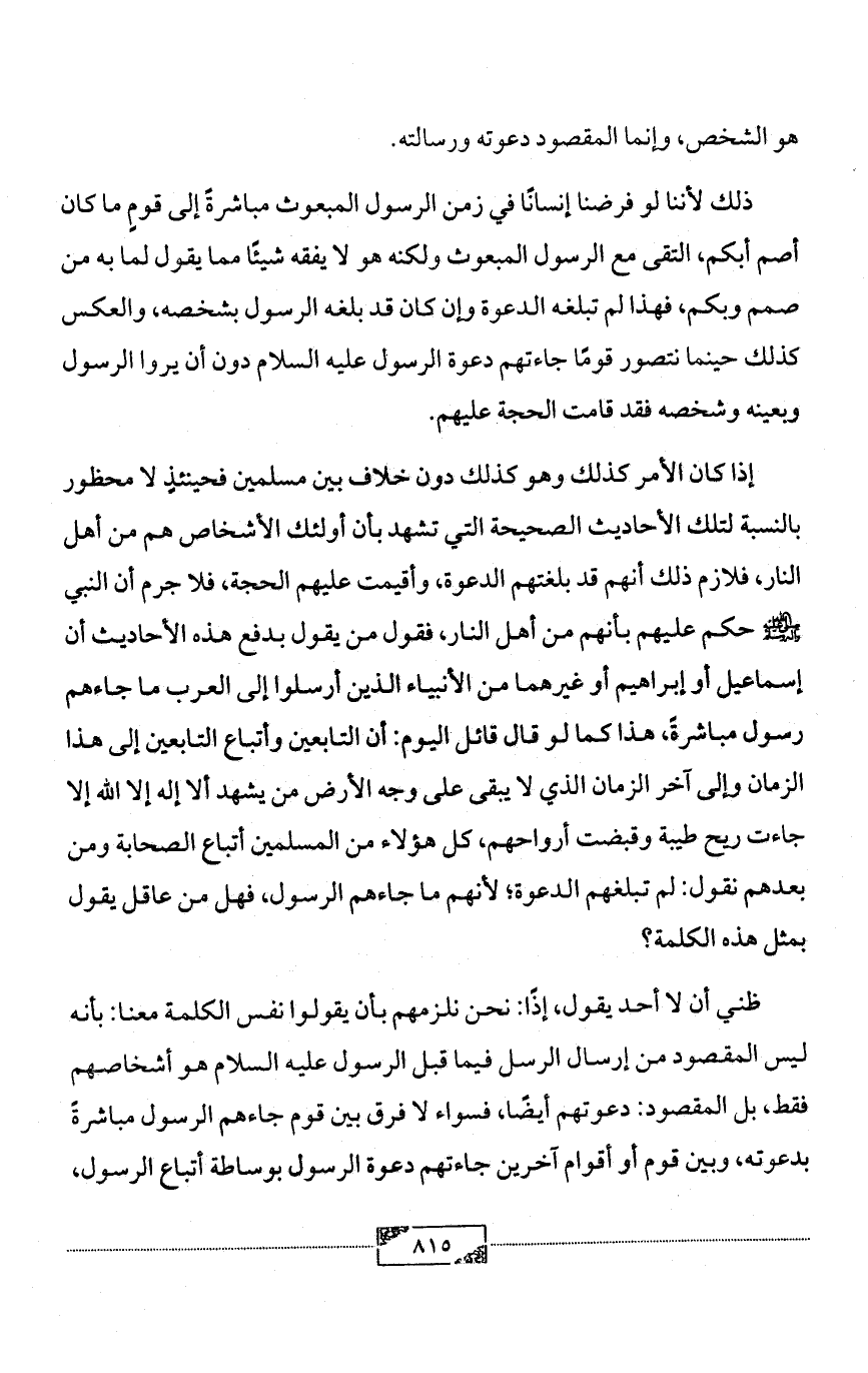 ظني أن لا أحد يقول، إذًا: نحن نلزمهم بأن يقولوا نفس الكلمة معنا: بأنه ليس المقصود من إرسال الرسل فيما قبل الرسول عليه السلام هو أشخاصهم فقط، بل المقصود: دعوتهم أيضًا، فسواء لا فرق بين قوم جاءهم الرسول مباشرةً بدعوته، وبين قوم أو أقوام آخرين جاءتهم دعوة الرسول بوساطة أتباع الرسول،