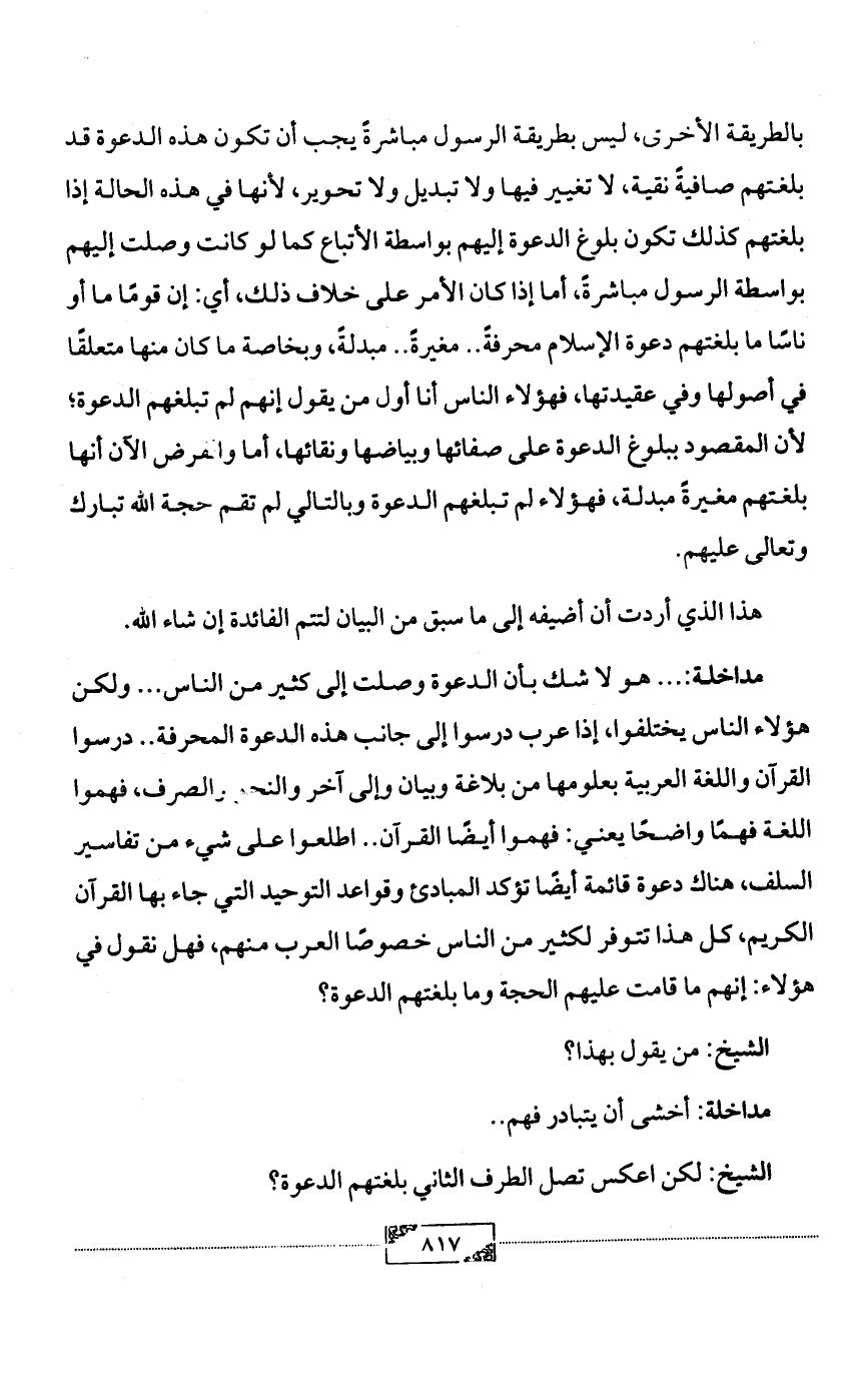 مداخلة: ... هو لا شك بأن الدعوة وصلت إلى كثير من الناس ... ولكن هؤلاء الناس يختلفوا، إذا عرب درسوا إلى جانب هذه الدعوة المحرفة .. درسوا القرآن واللغة العربية بعلومها من بلاغة وبيان وإلى آخر والنحو والصرف، فهموا اللغة فهمًا واضحًا يعني: فهموا أيضًا القرآن .. اطلعوا على شيء من تفاسير السلف، هناك دعوة قائمة أيضًا تؤكد المبادئ وقواعد التوحيد التي جاء بها القرآن الكريم، كل هذا تتوفر لكثير من الناس خصوصًا العرب منهم، فهل نقول في هؤلاء: إنهم ما قامت عليهم الحجة وما بلغتهم الدعوة؟