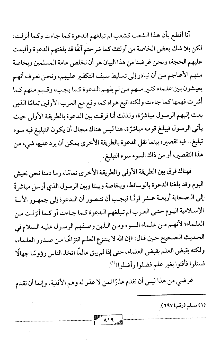 فهناك فرق بين الطريقة الأولى والطريقة الأخرى تمامًا، وما دمنا نحن نعيش اليوم وقد بلغنا الدعوة بالوسائط، وبخاصة وبيننا وبين الرسول الذي أرسل مباشرةً إلى الصحابة أربعة عشر قرنًا فيجب أن نتصور أن الدعوة إلى جمهور الأمة الإسلامية اليوم حتى العرب لم تبلغهم الدعوة كما جاءت أو كما أنزلت من العلماء؛ لأنهم من علماء السوء ومن الذين وصفهم الرسول عليه السلام في الحديث الصحيح حين قال: «إن الله لا ينتزع العلم انتزاعًا من صدور العلماء، ولكنه يقبض العلم بقبض العلماء، حتى إذا لم يبق عالمًا اتخذ الناس رؤوسًا جهالًا فسئلوا فأفتوا بغير علم فضلوا وأضلوا» (¬1).