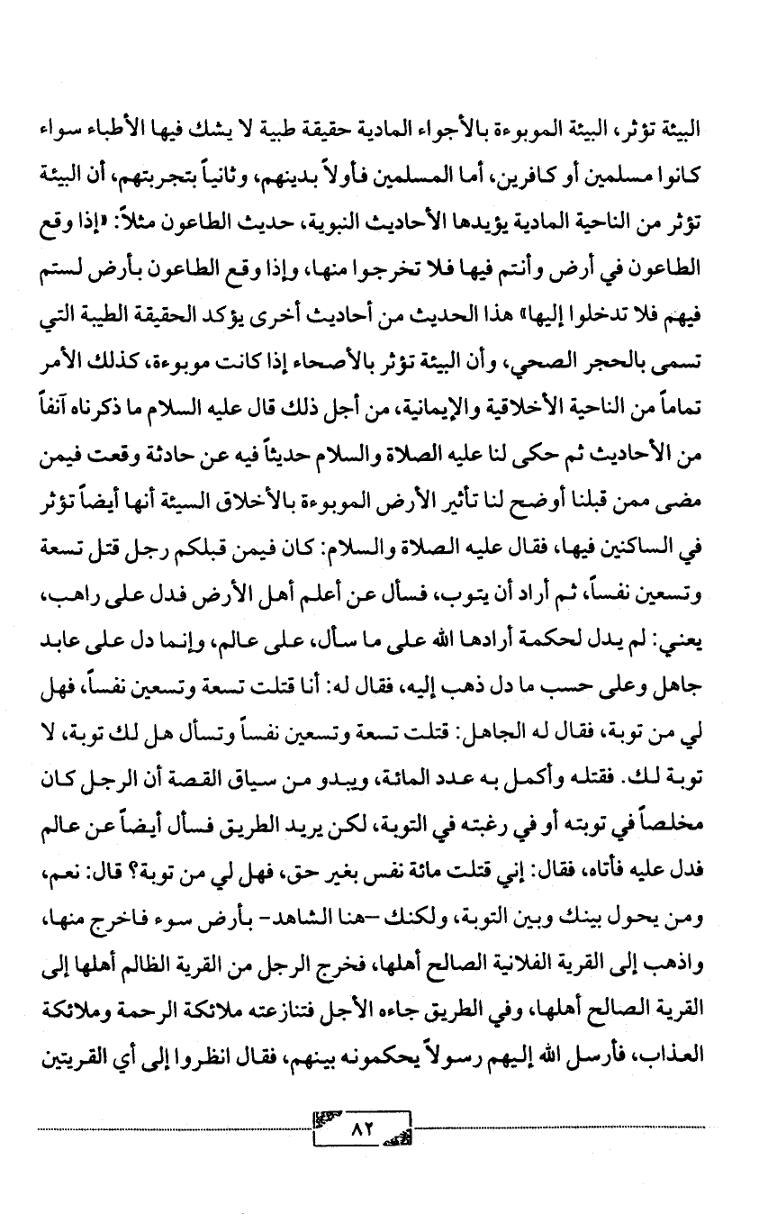 البيئة تؤثر، البيئة الموبوءة بالأجواء المادية حقيقة طبية لا يشك فيها الأطباء سواء كانوا مسلمين أو كافرين، أما المسلمين فأولاً بدينهم، وثانياً بتجربتهم، أن البيئة تؤثر من الناحية المادية يؤيدها الأحاديث النبوية، حديث الطاعون مثلاً: «إذا وقع الطاعون في أرض وأنتم فيها فلا تخرجوا منها، وإذا وقع الطاعون بأرض لستم فيهم فلا تدخلوا إليها» هذا الحديث من أحاديث أخرى يؤكد الحقيقة الطيبة التي تسمى بالحجر الصحي، وأن البيئة تؤثر بالأصحاء إذا كانت موبوءة، كذلك الأمر تماماً من الناحية الأخلاقية والإيمانية، من أجل ذلك قال عليه السلام ما ذكرناه آنفاً من الأحاديث ثم حكى لنا عليه الصلاة والسلام حديثاً فيه عن حادثة وقعت فيمن مضى ممن قبلنا أوضح لنا تأثير الأرض الموبوءة بالأخلاق السيئة أنها أيضاً تؤثر في الساكنين فيها، فقال عليه الصلاة والسلام: كان فيمن قبلكم رجل قتل تسعة وتسعين نفساً، ثم أراد أن يتوب، فسأل عن أعلم أهل الأرض فدل على راهب، يعني: لم يدل لحكمة أرادها الله على ما سأل، على عالم، وإنما دل على عابد جاهل وعلى حسب ما دل ذهب إليه، فقال له: أنا قتلت تسعة وتسعين نفساً، فهل لي من توبة، فقال له الجاهل: قتلت تسعة وتسعين نفساً وتسأل هل لك توبة، لا توبة لك. فقتله وأكمل به عدد المائة، ويبدو من سياق القصة أن الرجل كان مخلصاً في توبته أو في رغبته في التوبة، لكن يريد الطريق فسأل أيضاً عن عالم فدل عليه فأتاه، فقال: إني قتلت مائة نفس بغير حق، فهل لي من توبة؟ قال: نعم، ومن يحول بينك وبين التوبة، ولكنك -هنا الشاهد- بأرض سوء فاخرج منها، واذهب إلى القرية الفلانية الصالح أهلها، فخرج الرجل من القرية الظالم أهلها إلى القرية الصالح أهلها، وفي الطريق جاءه الأجل فتنازعته ملائكة الرحمة وملائكة العذاب، فأرسل الله إليهم رسولاً يحكمونه بينهم، فقال انظروا إلى أي القريتين