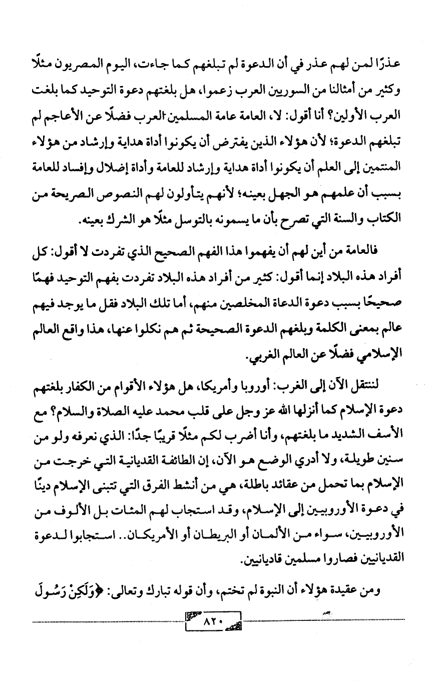 لننتقل الآن إلى الغرب: أوروبا وأمريكا، هل هؤلاء الأقوام من الكفار بلغتهم دعوة الإسلام كما أنزلها الله عز وجل على قلب محمد عليه الصلاة والسلام؟ مع الأسف الشديد ما بلغتهم، وأنا أضرب لكم مثلًا قريبًا جدًا: الذي نعرفه ولو من سنين طويلة، ولا أدري الوضع هو الآن، إن الطائفة القديانية التي خرجت من الإسلام بما تحمل من عقائد باطلة، هي من أنشط الفرق التي تتبنى الإسلام دينًا في دعوة الأوروبيين إلى الإسلام، وقد استجاب لهم المئات بل الألوف من الأوروبيين، سواء من الألمان أو البريطان أو الأمريكان .. استجابوا لدعوة القديانيين فصاروا مسلمين قاديانيين.