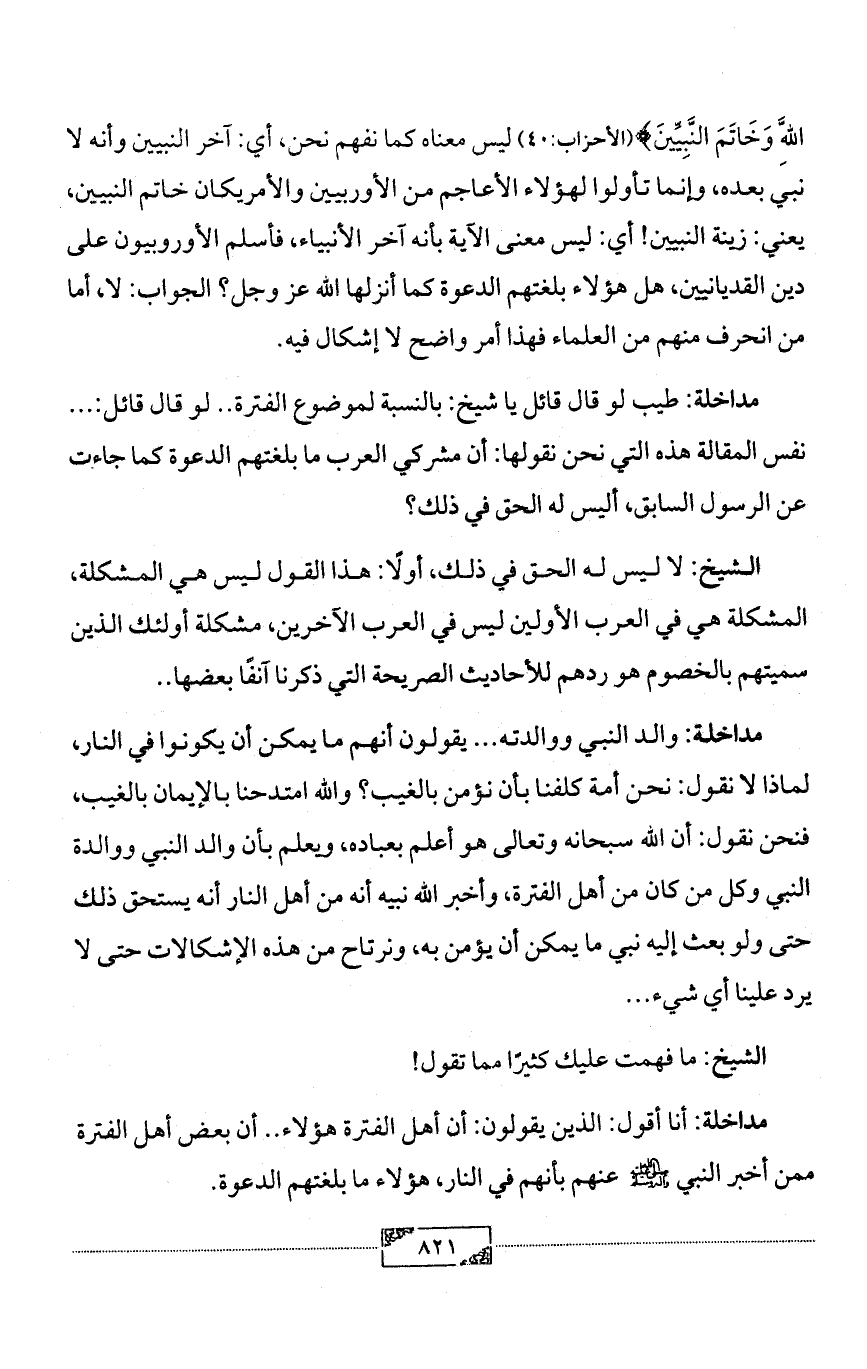مداخلة: أنا أقول: الذين يقولون: أن أهل الفترة هؤلاء .. أن بعض أهل الفترة ممن أخبر النبي - صلى الله عليه وآله وسلم - عنهم بأنهم في النار، هؤلاء ما بلغتهم الدعوة.