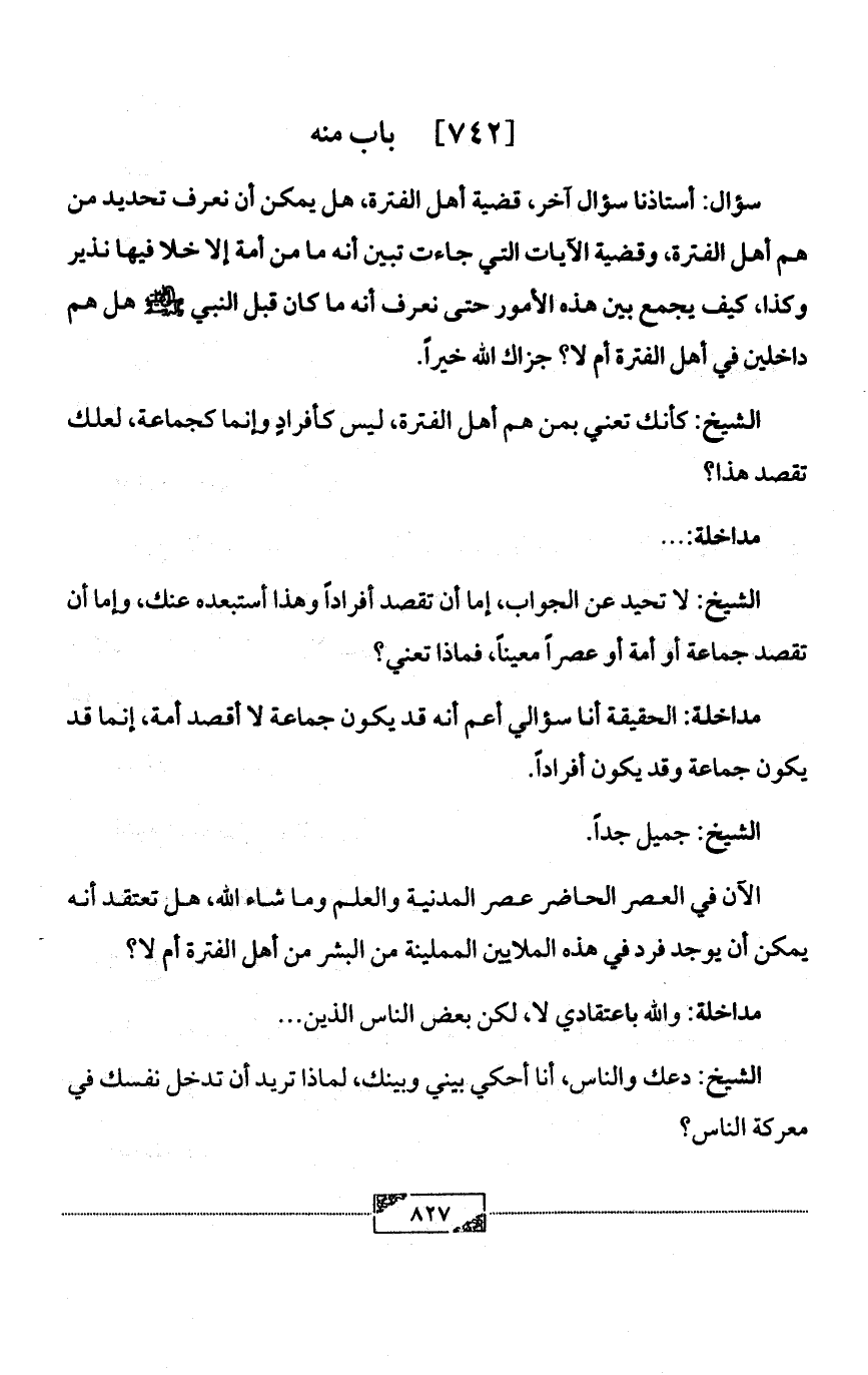 الآن في العصر الحاضر عصر المدنية والعلم وما شاء الله، هل تعتقد أنه يمكن أن يوجد فرد في هذه الملايين المملينة من البشر من أهل الفترة أم لا؟