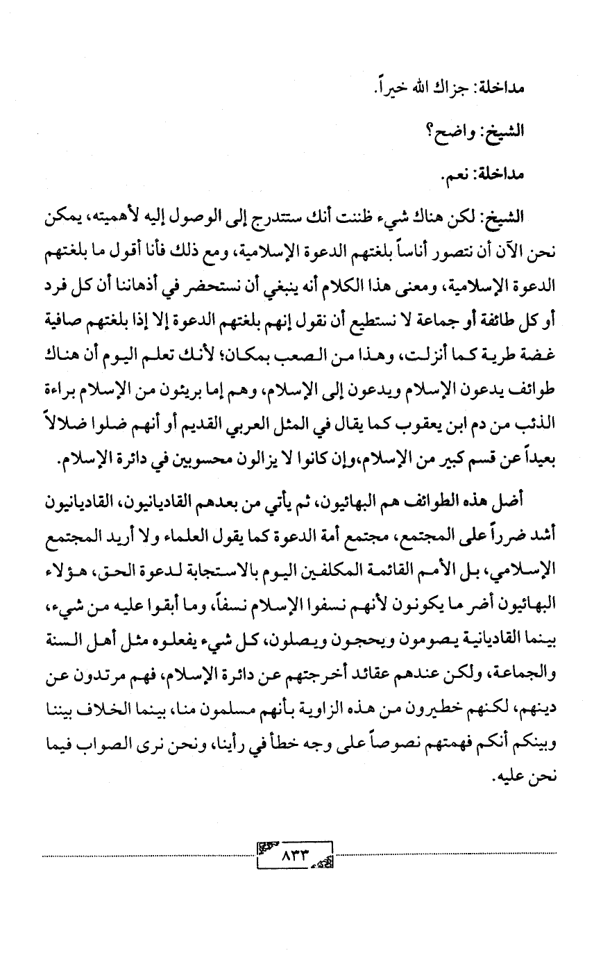 أضل هذه الطوائف هم البهائيون، ثم يأتي من بعدهم القاديانيون، القاديانيون أشد ضرراً على المجتمع، مجتمع أمة الدعوة كما يقول العلماء ولا أريد المجتمع الإسلامي، بل الأمم القائمة المكلفين اليوم بالاستجابة لدعوة الحق، هؤلاء البهائيون أضر ما يكونون لأنهم نسفوا الإسلام نسفاً، وما أبقوا عليه من شيء، بينما القاديانية يصومون ويحجون ويصلون، كل شيء يفعلوه مثل أهل السنة والجماعة، ولكن عندهم عقائد أخرجتهم عن دائرة الإسلام، فهم مرتدون عن دينهم، لكنهم خطيرون من هذه الزاوية بأنهم مسلمون منا، بينما الخلاف بيننا وبينكم أنكم فهمتهم نصوصاً على وجه خطأ في رأينا، ونحن نرى الصواب فيما نحن عليه.