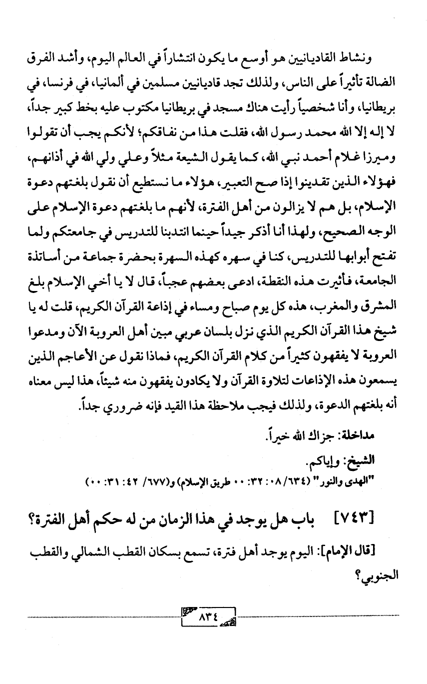 ونشاط القاديانيين هو أوسع ما يكون انتشاراً في العالم اليوم، وأشد الفرق الضالة تأثيراً على الناس، ولذلك تجد قاديانيين مسلمين في ألمانيا، في فرنسا، في بريطانيا، وأنا شخصياً رأيت هناك مسجد في بريطانيا مكتوب عليه بخط كبير جداً، لا إله إلا الله محمد رسول الله، فقلت هذا من نفاقكم؛ لأنكم يجب أن تقولوا وميرزا غلام أحمد نبي الله، كما يقول الشيعة مثلاً وعلي ولي الله في أذانهم، فهؤلاء الذين تقدينوا إذا صح التعبير، هؤلاء ما نستطيع أن نقول بلغتهم دعوة الإسلام، بل هم لا يزالون من أهل الفترة، لأنهم ما بلغتهم دعوة الإسلام على الوجه الصحيح، ولهذا أنا أذكر جيداً حينما انتدبنا للتدريس في جامعتكم ولما تفتح أبوابها للتدريس، كنا في سهره كهذه السهرة بحضرة جماعة من أساتذة الجامعة، فأثيرت هذه النقطة، ادعى بعضهم عجباً، قال لا يا أخي الإسلام بلغ المشرق والمغرب، هذه كل يوم صباح ومساء في إذاعة القرآن الكريم، قلت له يا شيخ هذا القرآن الكريم الذي نزل بلسان عربي مبين أهل العروبة الآن ومدعوا العروبة لا يفقهون كثيراً من كلام القرآن الكريم، فماذا نقول عن الأعاجم الذين يسمعون هذه الإذاعات لتلاوة القرآن ولا يكادون يفقهون منه شيئاً، هذا ليس معناه أنه بلغتهم الدعوة، ولذلك فيجب ملاحظة هذا القيد فإنه ضروري جداً.