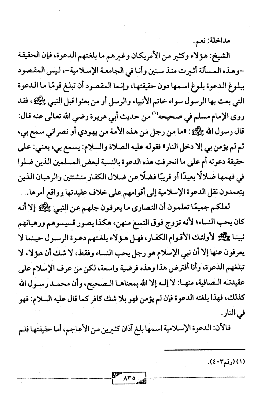 -وهذه المسألة أثيرت منذ سنين وأنا في الجامعة الإسلامية-، ليس المقصود ببلوغ الدعوة بلوغ اسمها دون حقيقتها، وإنما المقصود أن تبلغ قومًا ما الدعوة التي بعث بها الرسول سواء خاتم الأنبياء والرسل أو من بعثوا قبل النبي - صلى الله عليه وآله وسلم -، فقد روى الإمام مسلم في صحيحه (¬1) من حديث أبي هريرة رضي الله تعالى عنه قال: قال رسول الله - صلى الله عليه وآله وسلم -: «ما من رجل من هذه الأمة من يهودي أو نصراني سمع بي، ثم لم يؤمن بي إلا دخل النار» فقوله عليه الصلاة والسلام: يسمع بي، يعني: على حقيقة دعوته أم على ما انحرفت هذه الدعوة بالنسبة لبعض المسلمين الذين ضلوا في فهمها ضلالًا بعيدًا أو قريبًا فضلًا عن ضلال الكفار متشتتين والرهبان الذين يتعمدون نقل الدعوة الإسلامية إلى أقوامهم على خلاف عقيدتها وواقع أمرها.