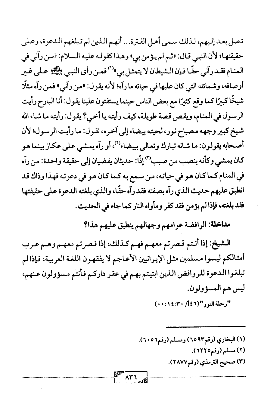 تصل بعد إليهم، لذلك سمى أهل الفترة ... أنهم الذين لم تبلغهم الدعوة، وعلى حقيقتها؛ لأن النبي قال: «ثم لم يؤمن بي» وهذا كقوله عليه السلام: «من رآني في المنام فقد رآني حقًا فإن الشيطان لا يتمثل بي» (¬1) فمن رأى النبي - صلى الله عليه وآله وسلم - على غير أوصافه، وشمائله التي كان عليها في حياته ما رآه؛ لأنه يقول: «من رآني» فمن رآه مثلًا شيخًا كبيرًا كما وقع كثيرًا مع بعض الناس حينما يستفتون علينا يقول: أنا البارح رأيت الرسول في المنام، ويقص قصة طويلة، كيف رأيته يا أخي؟ يقول: رأيته ما شاء الله شيخ كبير وجهه مصباح نور، لحيته بيضاء إلى آخره، نقول: ما رأيت الرسول؛ لأن أصحابه يقولون: ما شانه تبارك وتعالى ببيضاء (¬2)، أو رآه يمشي على عكاز بينما هو كان يمشي وكأنه ينصب من صبب (¬3) إذًا: حديثان يفضيان إلى حقيقة واحدة: من رآه في المنام كما كان هو في حياته، من سمع به كما كان هو في دعوته فهذا وذاك قد انطبق عليهم حديث الذي رآه بصفته فقد رآه حقًا، والذي بلغته الدعوة على حقيقتها فقد بلغته، فإذا لم يؤمن فقد كفر ومأواه النار كما جاء في الحديث.