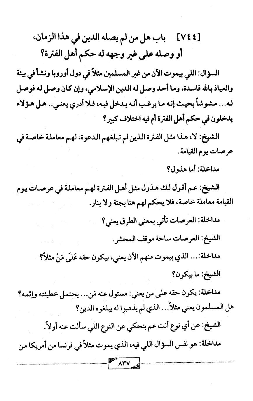 [744] باب هل من لم يصله الدين في هذا الزمان, أو وصله على غير وجهه له حكم أهل الفترة؟