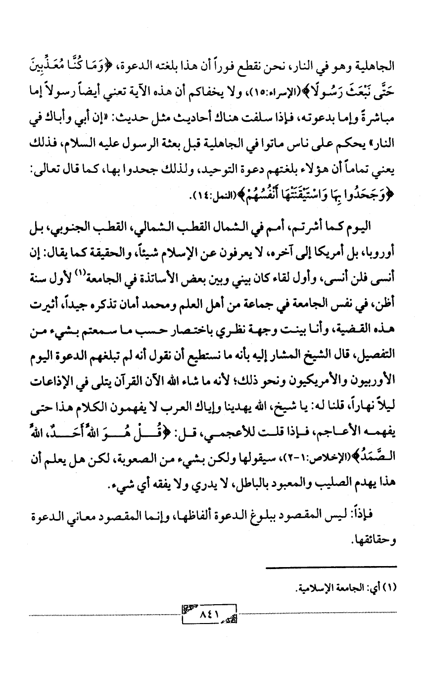اليوم كما أشرتم، أمم في الشمال القطب الشمالي، القطب الجنوبي، بل أوروبا، بل أمريكا إلى آخره، لا يعرفون عن الإسلام شيئاً، والحقيقة كما يقال: إن أنسى فلن أنسى، وأول لقاء كان بيني وبين بعض الأساتذة في الجامعة (¬1) لأول سنة أظن، في نفس الجامعة في جماعة من أهل العلم ومحمد أمان تذكره جيداً، أثيرت هذه القضية، وأنا بينت وجهة نظري باختصار حسب ما سمعتم بشيء من التفصيل، قال الشيخ المشار إليه بأنه ما نستطيع أن نقول أنه لم تبلغهم الدعوة اليوم الأوربيون والأمريكيون ونحو ذلك؛ لأنه ما شاء الله الآن القرآن يتلى في الإذاعات ليلاً نهاراً، قلنا له: يا شيخ، الله يهدينا وإياك العرب لا يفهمون الكلام هذا حتى يفهمه الأعاجم، فإذا قلت للأعجمي، قل: {قُلْ هُوَ اللَّهُ أَحَدٌ، اللَّهُ الصَّمَدُ} (الإخلاص:1 - 2)، سيقولها ولكن بشيء من الصعوبة، لكن هل يعلم أن هذا يهدم الصليب والمعبود بالباطل، لا يدري ولا يفقه أي شيء.