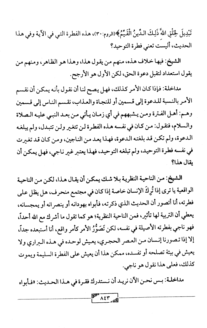 الشيخ: من الناحية النظرية بلا شك يمكن أن يقال هذا، لكن من الناحية الواقعية يا ترى إذا تُرِكَ الإنسان خاصة إذا كان في مجتمع منحرف، هل يظل على فطرته، أنا أتصور أن الحديث الذي ذكرته، فأبواه يهودانه أو ينصرانه أو يمجسانه، يعطي أن التربية لها تأثير، فمن الناحية النظرية؛ هو كما تقول ما أشرك مع الله أحداً، فهو ناجي بفطرته الأصيلة في نفسه، لكن تَصَوُّرُ الأمر كأمر واقع، أنا أستبعده جداً، إلا إذا تصورنا إنسان من العصر الحجري، يعيش لوحده في هذه البراري ولا يعيش في بيئة تصلحه أو تفسده، ممكن هذا أن يعيش على الفطرة السليمة ويموت كذلك، فعلى هذا نقول هو ناجي.