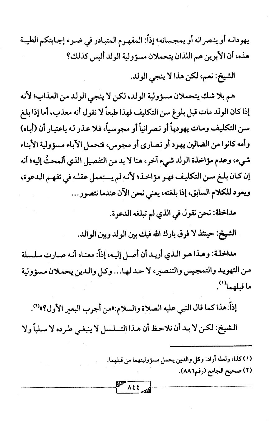 هم بلا شك يتحملان مسؤولية الولد، لكن لا ينجي الولد من العذاب؛ لأنه إذا كان الولد مات قبل بلوغ سن التكليف فهذا طبعاً لا نقول أنه معذب، أما إذا بلغ سن التكليف ومات يهودياً أو نصرانياً أو مجوسياً، فلا عذر له باعتبار أن (أباه) وأمه كانوا من الضالين يهود أو نصارى أو مجوس، فتحمل الآباء مسؤولية الأبناء شيء، وعدم مؤاخذة الولد شيء آخر، هنا لا بد من التفصيل الذي ألمحتُ إليه؛ أنه إن كان بلغ سن التكليف فهو مؤاخذ؛ لأنه لم يستعمل عقله في تفهم الدعوة، ويعود للكلام السابق، إذا بلغته، يعني نحن الآن عندما نتصور ...