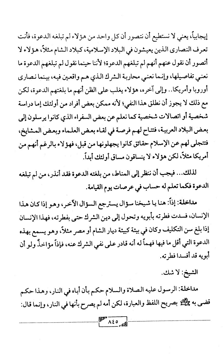 مداخلة: إذاً: هنا يا شيخنا سؤال يسترجع السؤال الآخر، وهو إذا كان هذا الإنسان، فسدت فطرته بأبويه وتحول إلى دين الشرك حتى بفطرته، فهذا الإنسان إذا بلغ سن التكليف وكان في بيئة كبيئة ديار الشام أو مصر مثلاً، وهو يسمع بهذه الدعوة التي أقل ما فيها فهماً له أنه قادر على نفي الشرك عنه، فإذاً مؤاخذٌ ولو أن أبويه قد أفسدا فطرته.