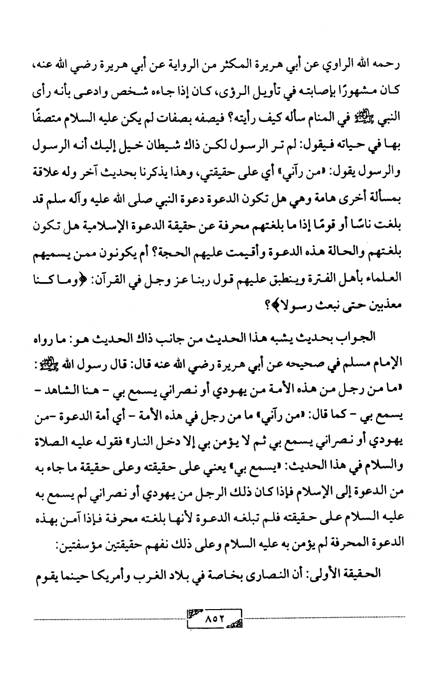 الجواب بحديث يشبه هذا الحديث من جانب ذاك الحديث هو: ما رواه الإمام مسلم في صحيحه عن أبي هريرة رضي الله عنه قال: قال رسول الله - صلى الله عليه وآله وسلم -: «ما من رجل من هذه الأمة من يهودي أو نصراني يسمع بي - هنا الشاهد - يسمع بي - كما قال: «من رآني» ما من رجل في هذه الأمة - أي أمة الدعوة -من يهودي أو نصراني يسمع بي ثم لا يؤمن بي إلا دخل النار» فقوله عليه الصلاة والسلام في هذا الحديث: «يسمع بي» يعني على حقيقته وعلى حقيقة ما جاء به من الدعوة إلى الإسلام فإذا كان ذلك الرجل من يهودي أو نصراني لم يسمع به عليه السلام على حقيقته فلم تبلغه الدعوة لأنها بلغته محرفة فإذا آمن بهذه الدعوة المحرفة لم يؤمن به عليه السلام وعلى ذلك نفهم حقيقتين مؤسفتين: