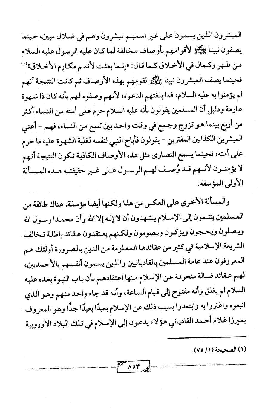 المبشرون الذين يسمون على غير اسمهم مبشرون وهم في ضلال مبين، حينما يصفون نبينا - صلى الله عليه وآله وسلم - لأقوامهم بأوصاف مخالفة لما كان عليه الرسول عليه السلام من طهر وكمال في الأخلاق كما قال: «إنما بعثت لأتمم مكارم الأخلاق» (¬1) فحينما يصف المبشرون نبينا - صلى الله عليه وآله وسلم - لقومهم بهذه الأوصاف ثم كانت النتيجة أنهم لم يؤمنوا به عليه السلام، فما بلغتهم الدعوة؛ لأنهم وصفوه لهم بأنه كان ذا شهوة عارمة ودليل أن المسلمين يقولون بأنه عليه السلام حرم على أمته من النساء أكثر من أربع بينما هو تزوج وجمع في وقت واحد بين تسع من النساء, فهم - أعني المبشرين الكذابين المفترين - يقولون فأباح النبي لنفسه لغلبة الشهوة عليه ما حرم على أمته, فحينما يسمع النصارى مثل هذه الأوصاف الكاذبة تكون النتيجة أنهم لا يؤمنون لأنهم قد وُصف لهم الرسول على غير حقيقته هذه المسألة