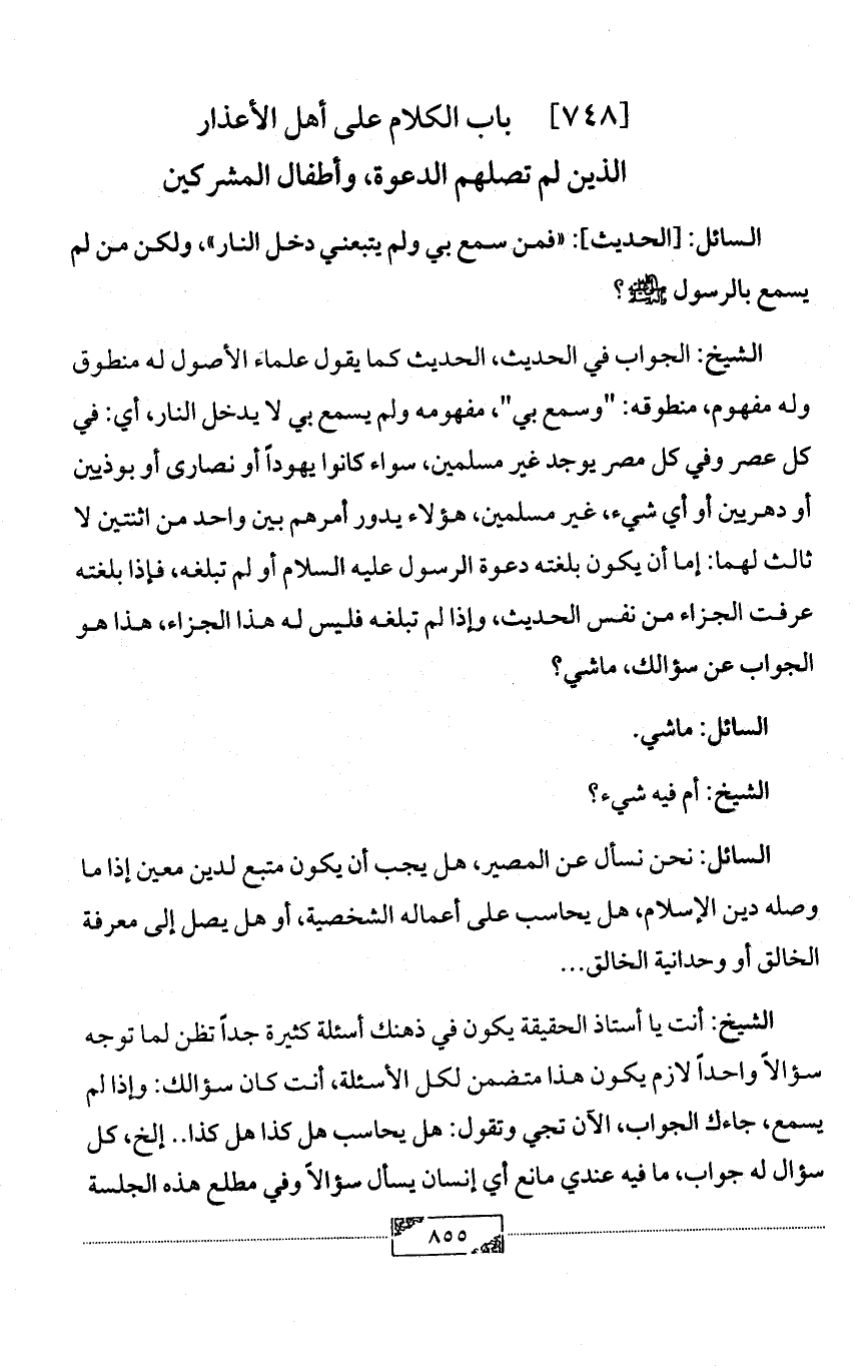 الشيخ: الجواب في الحديث، الحديث كما يقول علماء الأصول له منطوق وله مفهوم، منطوقه: "وسمع بي"، مفهومه ولم يسمع بي لا يدخل النار، أي: في كل عصر وفي كل مصر يوجد غير مسلمين، سواء كانوا يهوداً أو نصارى أو بوذيين أو دهريين أو أي شيء، غير مسلمين، هؤلاء يدور أمرهم بين واحد من اثنتين لا ثالث لهما: إما أن يكون بلغته دعوة الرسول عليه السلام أو لم تبلغه، فإذا بلغته عرفت الجزاء من نفس الحديث، وإذا لم تبلغه فليس له هذا الجزاء، هذا هو الجواب عن سؤالك، ماشي؟