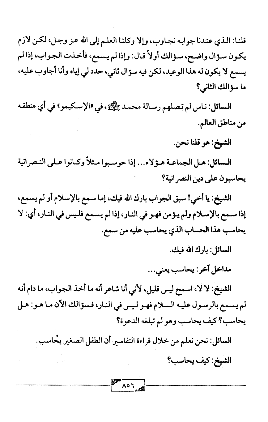 الشيخ: لا لا، اسمح ليس قليل، لأني أنا شاعر أنه ما أخذ الجواب، ما دام أنه لم يسمع بالرسول عليه السلام فهو ليس في النار، فسؤالك الآن ما هو: هل يحاسب؟ كيف يحاسب وهو لم تبلغه الدعوة؟