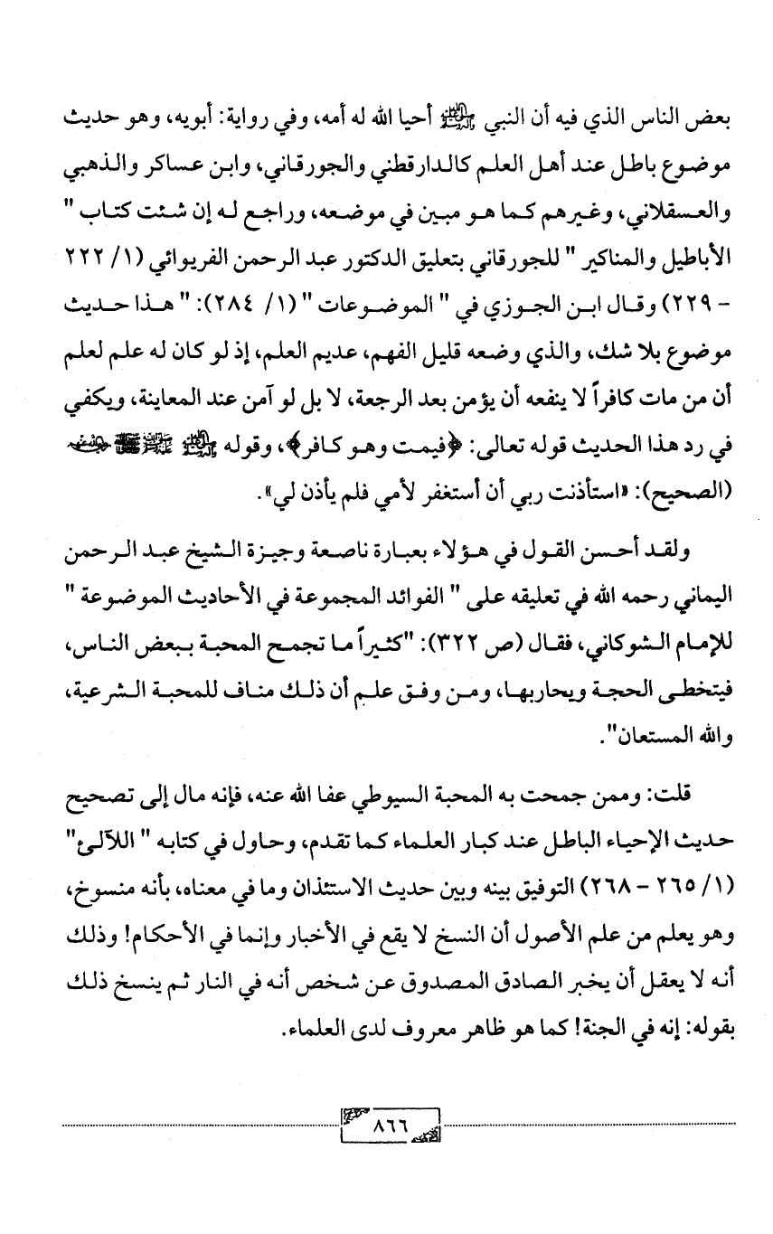 بعض الناس الذي فيه أن النبي - صلى الله عليه وآله وسلم - أحيا الله له أمه، وفي رواية: أبويه، وهو حديث موضوع باطل عند أهل العلم كالدارقطني والجورقاني، وابن عساكر والذهبي والعسقلاني، وغيرهم كما هو مبين في موضعه، وراجع له إن شئت كتاب " الأباطيل والمناكير " للجورقاني بتعليق الدكتور عبد الرحمن الفريوائي (1/ 222 - 229) وقال ابن الجوزي في " الموضوعات " (1/ 284): " هذا حديث موضوع بلا شك، والذي وضعه قليل الفهم، عديم العلم، إذ لو كان له علم لعلم أن من مات كافراً لا ينفعه أن يؤمن بعد الرجعة، لا بل لو آمن عند المعاينة، ويكفي في رد هذا الحديث قوله تعالى: {فيمت وهو كافر}، وقوله - صلى الله عليه وآله وسلم - صلى الله عليه وسلم - رضي الله عنهم - (الصحيح): «استأذنت ربي أن أستغفر لأمي فلم يأذن لي».