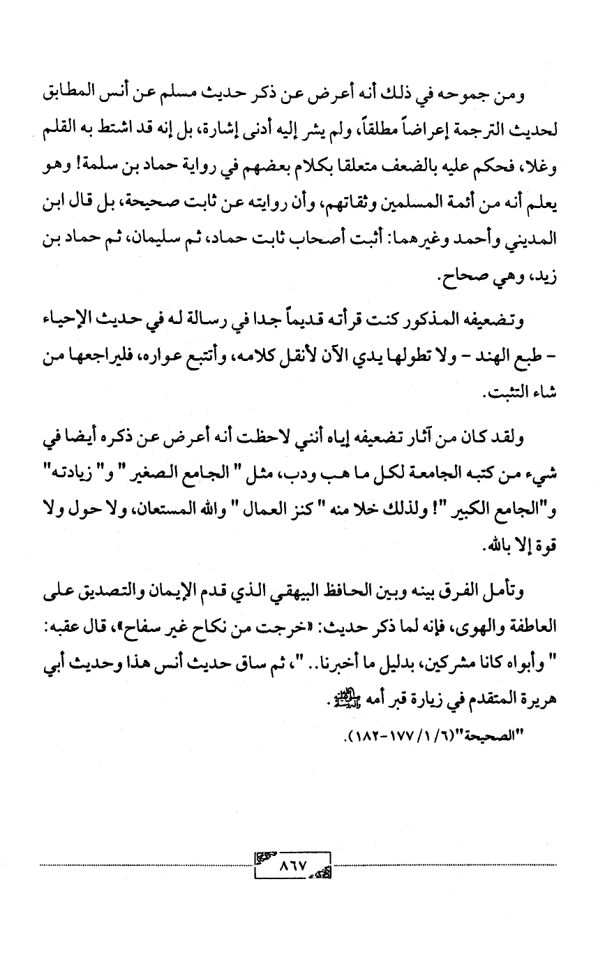 ومن جموحه في ذلك أنه أعرض عن ذكر حديث مسلم عن أنس المطابق لحديث الترجمة إعراضاً مطلقاً، ولم يشر إليه أدنى إشارة، بل إنه قد اشتط به القلم وغلا، فحكم عليه بالضعف متعلقا بكلام بعضهم في رواية حماد بن سلمة! وهو يعلم أنه من أئمة المسلمين وثقاتهم، وأن روايته عن ثابت صحيحة، بل قال ابن المديني وأحمد وغيرهما: أثبت أصحاب ثابت حماد، ثم سليمان، ثم حماد بن زيد، وهي صحاح.