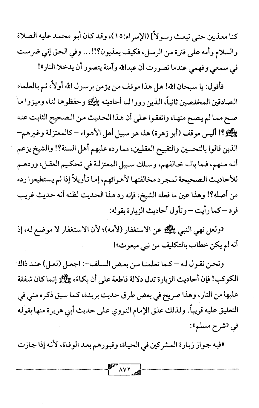 كنا معذبين حتى نبعث رسولاً] (الإسراء:15) , وقد كان أبو محمد عليه الصلاة والسلام وأمه على فترة من الرسل, فكيف يعذبون؟!! ... وفي الحق إني ضرست في سمعي وفهمي عندما تصورت أن عبد الله وآمنة يتصور أن يدخلا النار»!