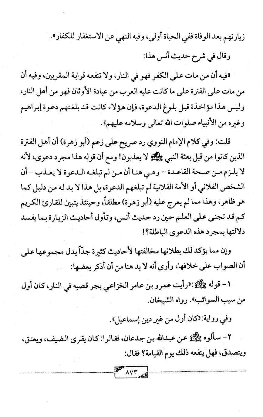 قلت: وفي كلام الإمام النووي رد صريح على زعم (أبو زهرة) أن أهل الفترة الذين كانوا من قبل بعثة النبي - صلى الله عليه وآله وسلم - لا يعذبون! ومع أن قوله هذا مجرد دعوى, لأنه لا يلزم من صحة القاعدة - وهي هنا أن من لم تبلغه الدعوة لا يعذب - أن الشخص الفلاني أو الأمة الفلانية لم تبلغهم الدعوة, بل هذا لا بد له من دليل كما هو ظاهر, وهذا مما لم يعرج عليه (أبو زهرة) مطلقاً, وحينئذ يتبين للقارئ الكريم كم قد تجنى على العلم حين رد حديث أنس, وتأول أحاديث الزيارة بما يفسد دلالتها بمجرد هذه الدعوى الباطلة؟!