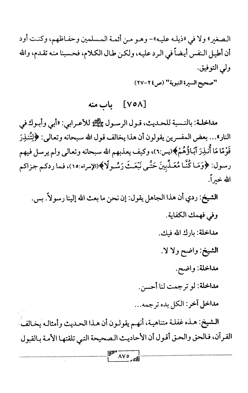 مداخلة: بالنسبة للحديث، قول الرسول - صلى الله عليه وآله وسلم - للأعرابي: «أبي وأبوك في النار» ... بعض المفسرين يقولون أن هذا يخالف قول الله سبحانه وتعالى: {لِتُنذِرَ قَوْمًا مَا أُنذِرَ آبَاؤُهُمْ} (يس:6)، وكيف يعذبهم الله سبحانه وتعالى ولم يرسل فيهم رسول: {وَمَا كُنَّا مُعَذِّبِينَ حَتَّى نَبْعَثَ رَسُولًا} (الإسراء:15)، فما ردكم جزاكم