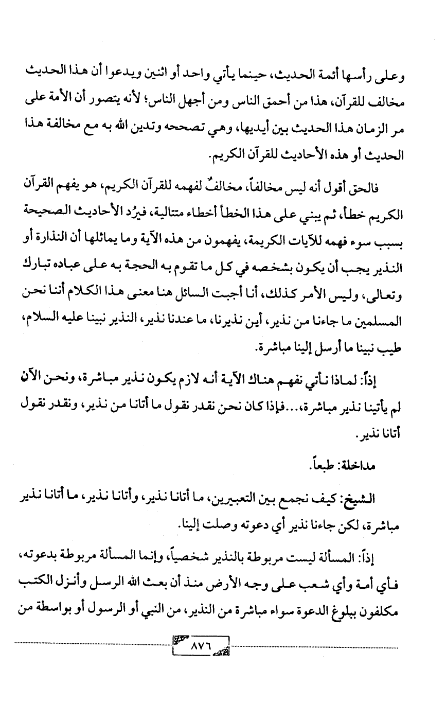 فالحق أقول أنه ليس مخالفاً، مخالفٌ لفهمه للقرآن الكريم، هو يفهم القرآن الكريم خطأ، ثم يبني على هذا الخطأ أخطاء متتالية، فيرُد الأحاديث الصحيحة بسبب سوء فهمه للآيات الكريمة، يفهمون من هذه الآية وما يماثلها أن النذارة أو النذير يجب أن يكون بشخصه في كل ما تقوم به الحجة به على عباده تبارك وتعالى، وليس الأمر كذلك، أنا أجبت السائل هنا معنى هذا الكلام أننا نحن المسلمين ما جاءنا من نذير، أين نذيرنا، ما عندنا نذير، النذير نبينا عليه السلام، طيب نبينا ما أرسل إلينا مباشرة.