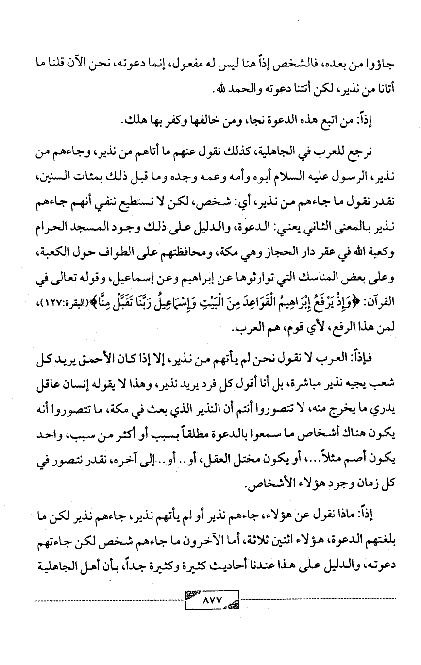 نرجع للعرب في الجاهلية، كذلك نقول عنهم ما أتاهم من نذير، وجاءهم من نذير، الرسول عليه السلام أبوه وأمه وعمه وجده وما قبل ذلك بمئات السنين، نقدر نقول ما جاءهم من نذير، أي: شخص، لكن لا نستطيع ننفي أنهم جاءهم نذير بالمعنى الثاني يعني: الدعوة، والدليل على ذلك وجود المسجد الحرام وكعبة الله في عقر دار الحجاز وهي مكة، ومحافظتهم على الطواف حول الكعبة، وعلى بعض المناسك التي توارثوها عن إبراهيم وعن إسماعيل، وقوله تعالى في القرآن: {وَإِذْ يَرْفَعُ إِبْرَاهِيمُ الْقَوَاعِدَ مِنَ الْبَيْتِ وَإِسْمَاعِيلُ رَبَّنَا تَقَبَّلْ مِنَّا} (البقرة:127)، لمن هذا الرفع، لأي قوم، هم العرب.