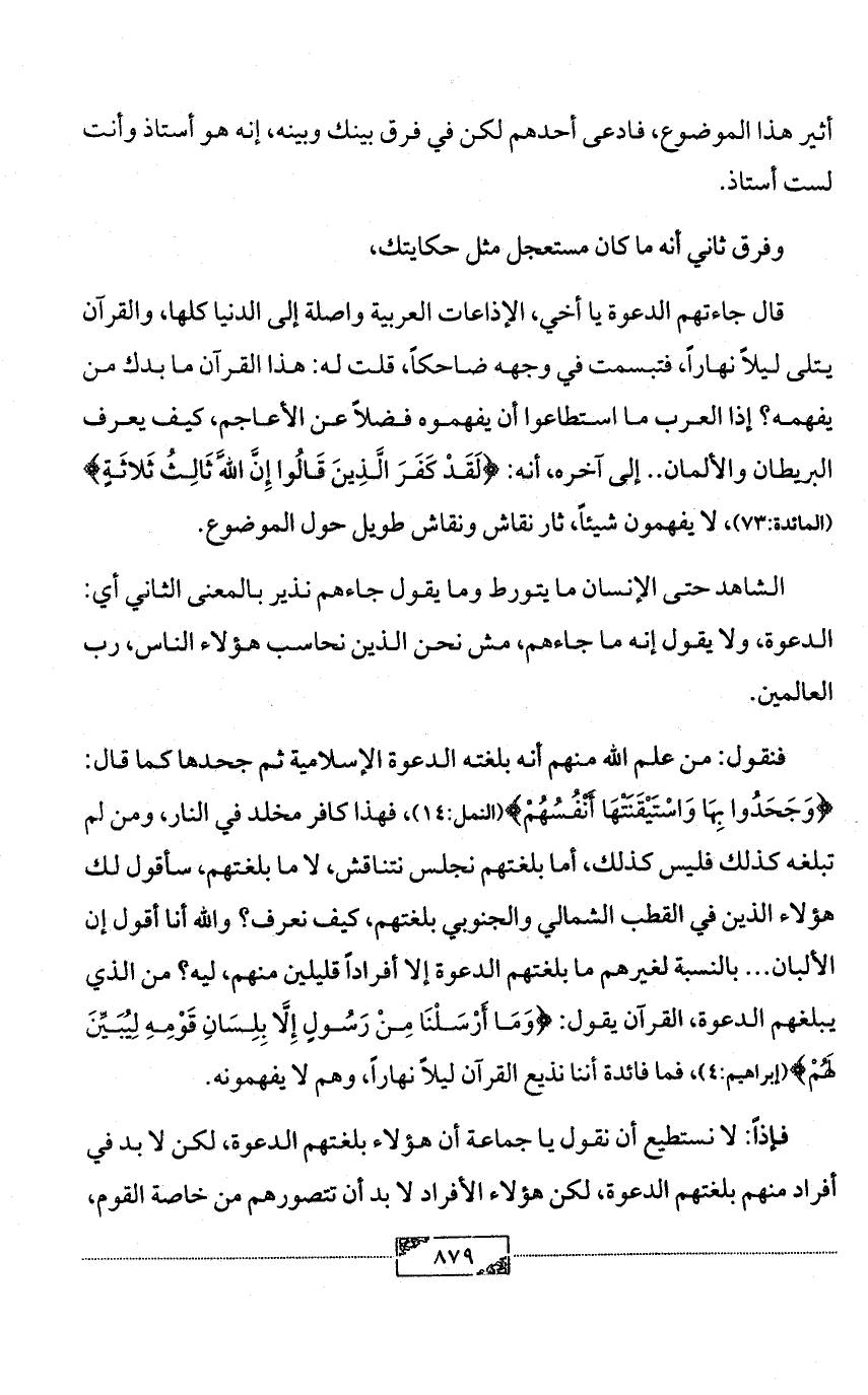 قال جاءتهم الدعوة يا أخي، الإذاعات العربية واصلة إلى الدنيا كلها، والقرآن يتلى ليلاً نهاراً، فتبسمت في وجهه ضاحكاً، قلت له: هذا القرآن ما بدك من يفهمه؟ إذا العرب ما استطاعوا أن يفهموه فضلاً عن الأعاجم، كيف يعرف البريطان والألمان .. إلى آخره، أنه: {لَقَدْ كَفَرَ الَّذِينَ قَالُوا إِنَّ اللَّهَ ثَالِثُ ثَلاثَةٍ} (المائدة:73)، لا يفهمون شيئاً، ثار نقاش ونقاش طويل حول الموضوع.
