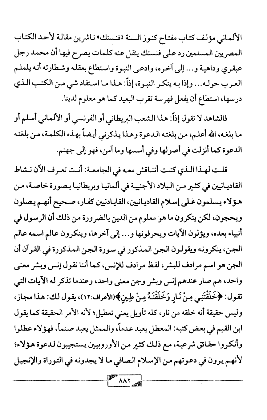 الألماني مؤلف كتاب مفتاح كنوز السنة «فنسنك» ناشرين مقالة لأحد الكتاب المصريين المسلمين رد على فنسنك ينقل عنه كلمات يصرح فيها أن محمد رجل عبقري وداهية و ... إلى آخره، وادعى النبوة واستطاع بعقله وشطارته أنه يلملم العرب حوله ... وإذا به ينكر النبوة، إذاً: هذا ما استفاد شي من الكتب الذي درسها، استطاع أن يفعل فهرسة تقرب البعيد كما هو معلوم لدينا.