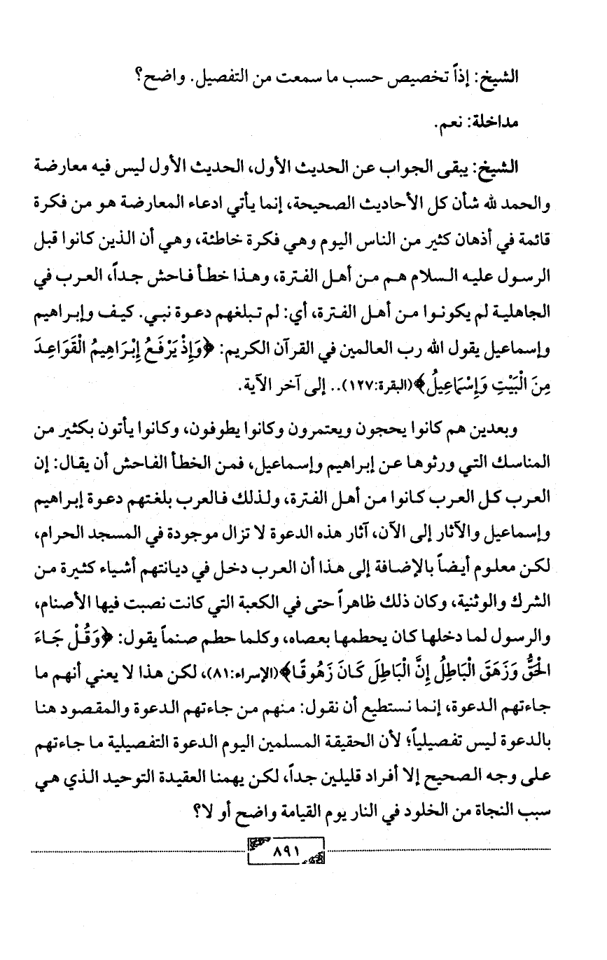 وبعدين هم كانوا يحجون ويعتمرون وكانوا يطوفون، وكانوا يأتون بكثير من المناسك التي ورثوها عن إبراهيم وإسماعيل، فمن الخطأ الفاحش أن يقال: إن العرب كل العرب كانوا من أهل الفترة، ولذلك فالعرب بلغتهم دعوة إبراهيم وإسماعيل والآثار إلى الآن، آثار هذه الدعوة لا تزال موجودة في المسجد الحرام، لكن معلوم أيضاً بالإضافة إلى هذا أن العرب دخل في ديانتهم أشياء كثيرة من الشرك والوثنية، وكان ذلك ظاهراً حتى في الكعبة التي كانت نصبت فيها الأصنام، والرسول لما دخلها كان يحطمها بعصاه، وكلما حطم صنماً يقول: {وَقُلْ جَاءَ الْحَقُّ وَزَهَقَ الْبَاطِلُ إِنَّ الْبَاطِلَ كَانَ زَهُوقًا} (الإسراء:81)، لكن هذا لا يعني أنهم ما جاءتهم الدعوة، إنما نستطيع أن نقول: منهم من جاءتهم الدعوة والمقصود هنا بالدعوة ليس تفصيلياً؛ لأن الحقيقة المسلمين اليوم الدعوة التفصيلية ما جاءتهم على وجه الصحيح إلا أفراد قليلين جداً، لكن يهمنا العقيدة التوحيد الذي هي سبب النجاة من الخلود في النار يوم القيامة واضح أو لا؟
