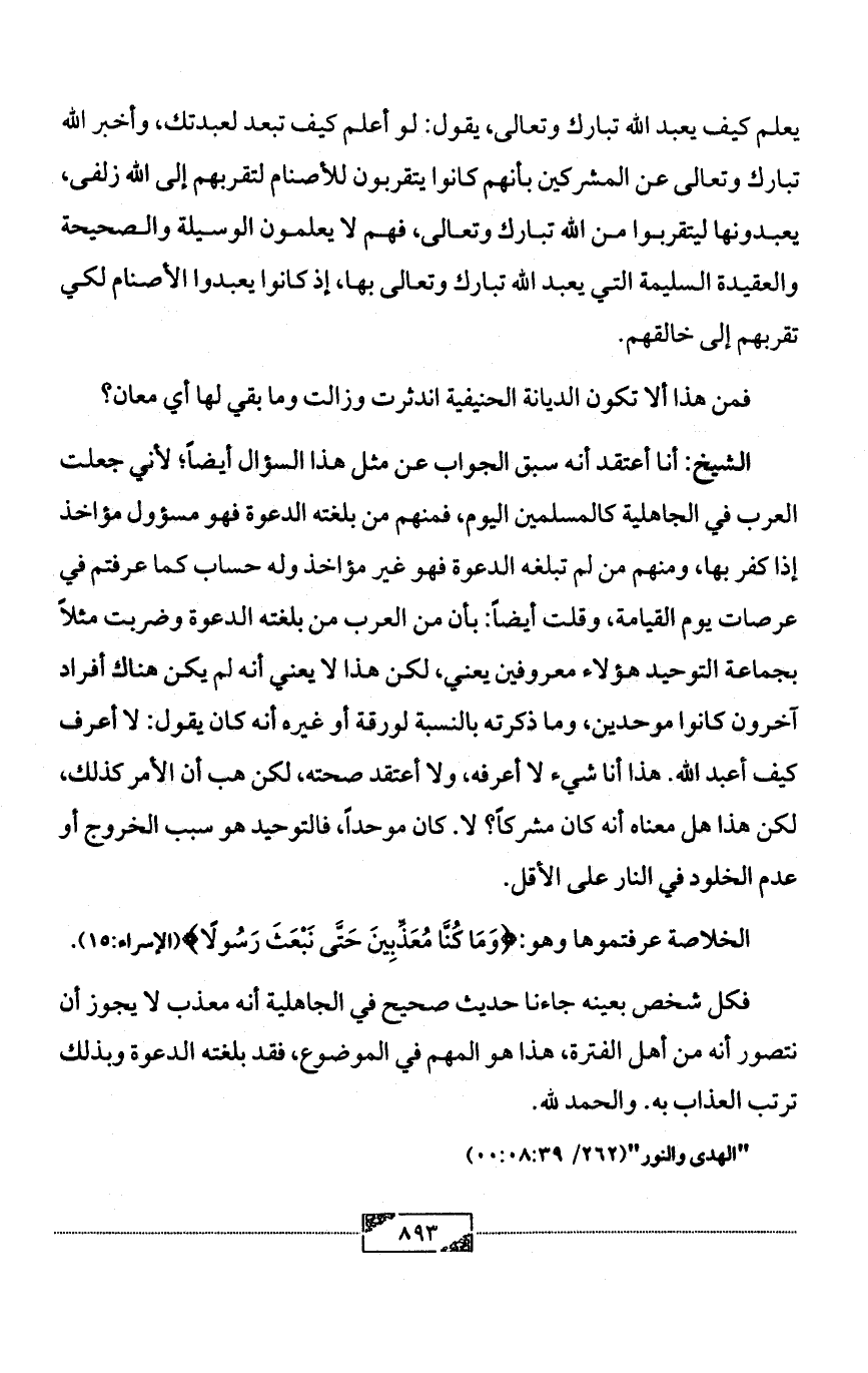 الشيخ: أنا أعتقد أنه سبق الجواب عن مثل هذا السؤال أيضاً؛ لأني جعلت العرب في الجاهلية كالمسلمين اليوم، فمنهم من بلغته الدعوة فهو مسؤول مؤاخذ إذا كفر بها، ومنهم من لم تبلغه الدعوة فهو غير مؤاخذ وله حساب كما عرفتم في عرصات يوم القيامة، وقلت أيضاً: بأن من العرب من بلغته الدعوة وضربت مثلاً بجماعة التوحيد هؤلاء معروفين يعني، لكن هذا لا يعني أنه لم يكن هناك أفراد آخرون كانوا موحدين، وما ذكرته بالنسبة لورقة أو غيره أنه كان يقول: لا أعرف كيف أعبد الله. هذا أنا شيء لا أعرفه، ولا أعتقد صحته، لكن هب أن الأمر كذلك، لكن هذا هل معناه أنه كان مشركاً؟ لا. كان موحداً، فالتوحيد هو سبب الخروج أو عدم الخلود في النار على الأقل.