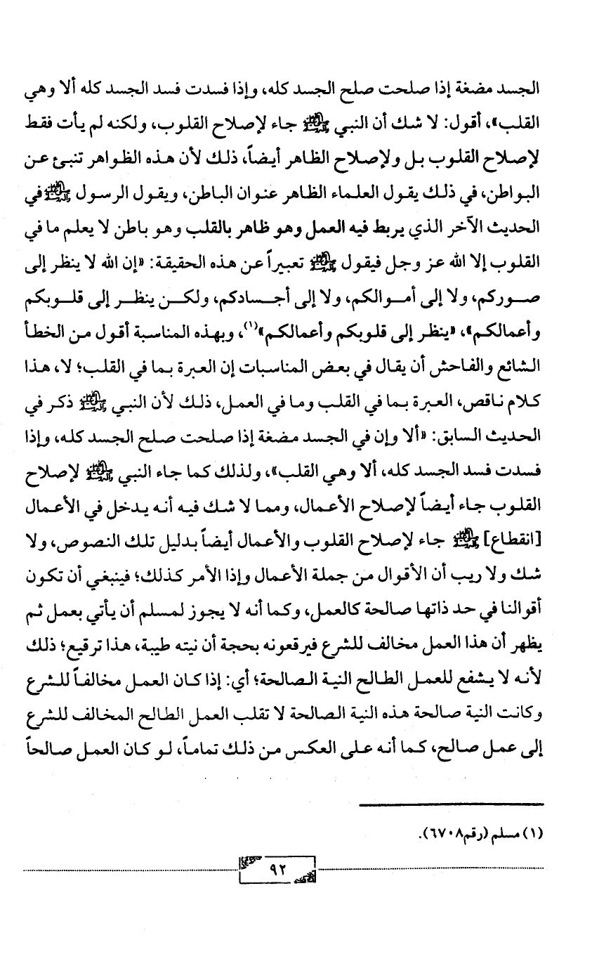 الجسد مضغة إذا صلحت صلح الجسد كله، وإذا فسدت فسد الجسد كله ألا وهي القلب»، أقول: لا شك أن النبي - صلى الله عليه وآله وسلم - جاء لإصلاح القلوب، ولكنه لم يأت فقط لإصلاح القلوب بل ولإصلاح الظاهر أيضاً، ذلك لأن هذه الظواهر تنبئ عن البواطن، في ذلك يقول العلماء الظاهر عنوان الباطن، ويقول الرسول - صلى الله عليه وآله وسلم - في الحديث الآخر الذي يربط فيه العمل وهو ظاهر بالقلب وهو باطن لا يعلم ما في القلوب إلا الله عز وجل فيقول - صلى الله عليه وآله وسلم - تعبيراً عن هذه الحقيقة: «إن الله لا ينظر إلى صوركم، ولا إلى أموالكم، ولا إلى أجسادكم، ولكن ينظر إلى قلوبكم وأعمالكم»، «ينظر إلى قلوبكم وأعمالكم» (¬1)، وبهذه المناسبة أقول من الخطأ الشائع والفاحش أن يقال في بعض المناسبات إن العبرة بما في القلب؛ لا، هذا كلام ناقص، العبرة بما في القلب وما في العمل، ذلك لأن النبي - صلى الله عليه وآله وسلم - ذكر في الحديث السابق: «ألا وإن في الجسد مضغة إذا صلحت صلح الجسد كله، وإذا فسدت فسد الجسد كله، ألا وهي القلب»، ولذلك كما جاء النبي - صلى الله عليه وآله وسلم - لإصلاح القلوب جاء أيضاً لإصلاح الأعمال، ومما لا شك فيه أنه يدخل في الأعمال [انقطاع]- صلى الله عليه وآله وسلم - جاء لإصلاح القلوب والأعمال أيضاً بدليل تلك النصوص، ولا شك ولا ريب أن الأقوال من جملة الأعمال وإذا الأمر كذلك؛ فينبغي أن تكون أقوالنا في حد ذاتها صالحة كالعمل، وكما أنه لا يجوز لمسلم أن يأتي بعمل ثم يظهر أن هذا العمل مخالف للشرع فيرقعونه بحجة أن نيته طيبة، هذا ترقيع؛ ذلك لأنه لا يشفع للعمل الطالح النية الصالحة؛ أي: إذا كان العمل مخالفاً للشرع وكانت النية صالحة هذه النية الصالحة لا تقلب العمل الطالح المخالف للشرع إلى عمل صالح، كما أنه على العكس من ذلك تماماً، لو كان العمل صالحاً