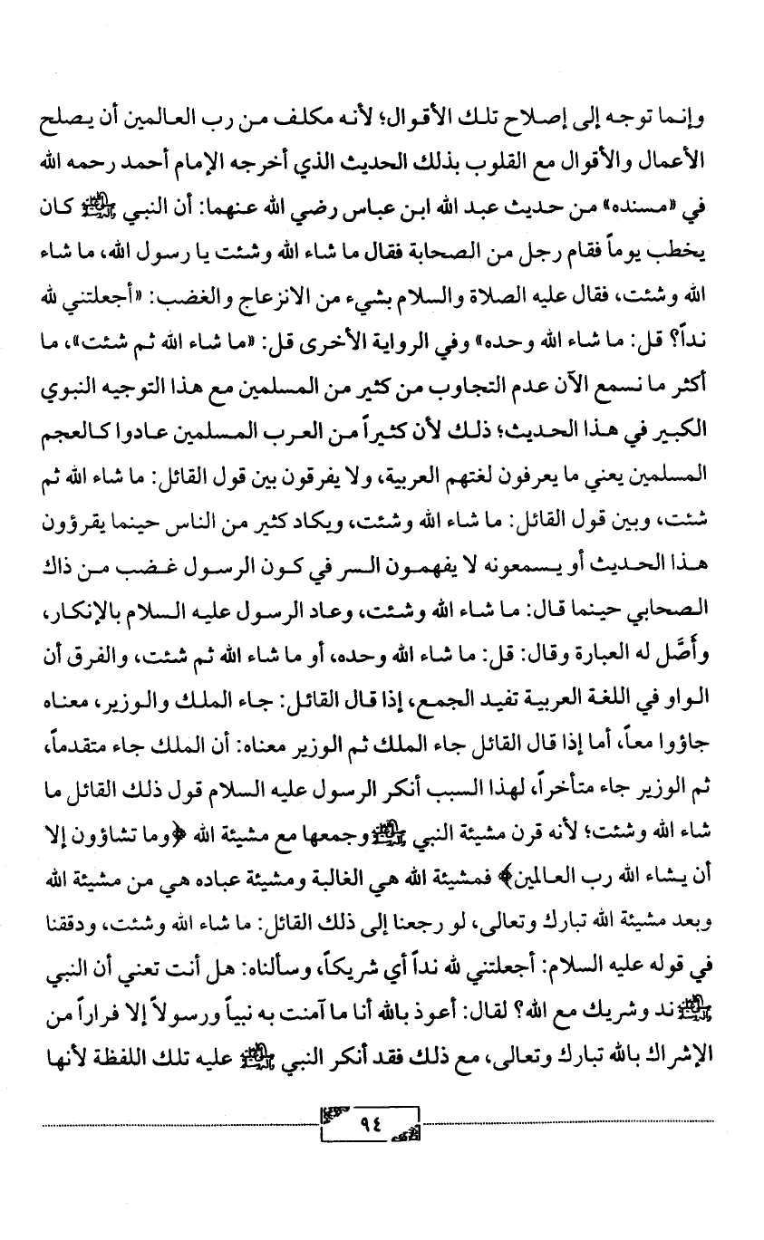وإنما توجه إلى إصلاح تلك الأقوال؛ لأنه مكلف من رب العالمين أن يصلح الأعمال والأقوال مع القلوب بذلك الحديث الذي أخرجه الإمام أحمد رحمه الله في «مسنده» من حديث عبد الله ابن عباس رضي الله عنهما: أن النبي - صلى الله عليه وآله وسلم - كان يخطب يوماً فقام رجل من الصحابة فقال ما شاء الله وشئت يا رسول الله، ما شاء الله وشئت، فقال عليه الصلاة والسلام بشيء من الانزعاج والغضب: «أجعلتني لله نداً؟ قل: ما شاء الله وحده» وفي الرواية الأخرى قل: «ما شاء الله ثم شئت»، ما أكثر ما نسمع الآن عدم التجاوب من كثير من المسلمين مع هذا التوجيه النبوي الكبير في هذا الحديث؛ ذلك لأن كثيراً من العرب المسلمين عادوا كالعجم المسلمين يعني ما يعرفون لغتهم العربية، ولا يفرقون بين قول القائل: ما شاء الله ثم شئت، وبين قول القائل: ما شاء الله وشئت، ويكاد كثير من الناس حينما يقرؤون هذا الحديث أو يسمعونه لا يفهمون السر في كون الرسول غضب من ذاك الصحابي حينما قال: ما شاء الله وشئت، وعاد الرسول عليه السلام بالإنكار، وأَصَّل له العبارة وقال: قل: ما شاء الله وحده، أو ما شاء الله ثم شئت، والفرق أن الواو في اللغة العربية تفيد الجمع، إذا قال القائل: جاء الملك والوزير، معناه جاؤوا معاً، أما إذا قال القائل جاء الملك ثم الوزير معناه: أن الملك جاء متقدماً، ثم الوزير جاء متأخراً، لهذا السبب أنكر الرسول عليه السلام قول ذلك القائل ما شاء الله وشئت؛ لأنه قرن مشيئة النبي - صلى الله عليه وآله وسلم - وجمعها مع مشيئة الله {وما تشاؤون إلا أن يشاء الله رب العالمين} فمشيئة الله هي الغالبة ومشيئة عباده هي من مشيئة الله وبعد مشيئة الله تبارك وتعالى، لو رجعنا إلى ذلك القائل: ما شاء الله وشئت، ودققنا في قوله عليه السلام: أجعلتني لله نداً أي شريكاً، وسألناه: هل أنت تعني أن النبي - صلى الله عليه وآله وسلم - ند وشريك مع الله؟ لقال: أعوذ بالله أنا ما آمنت به نبياً ورسولاً إلا فراراً من الإشراك بالله تبارك وتعالى، مع ذلك فقد أنكر النبي - صلى الله عليه وآله وسلم - عليه تلك اللفظة لأنها