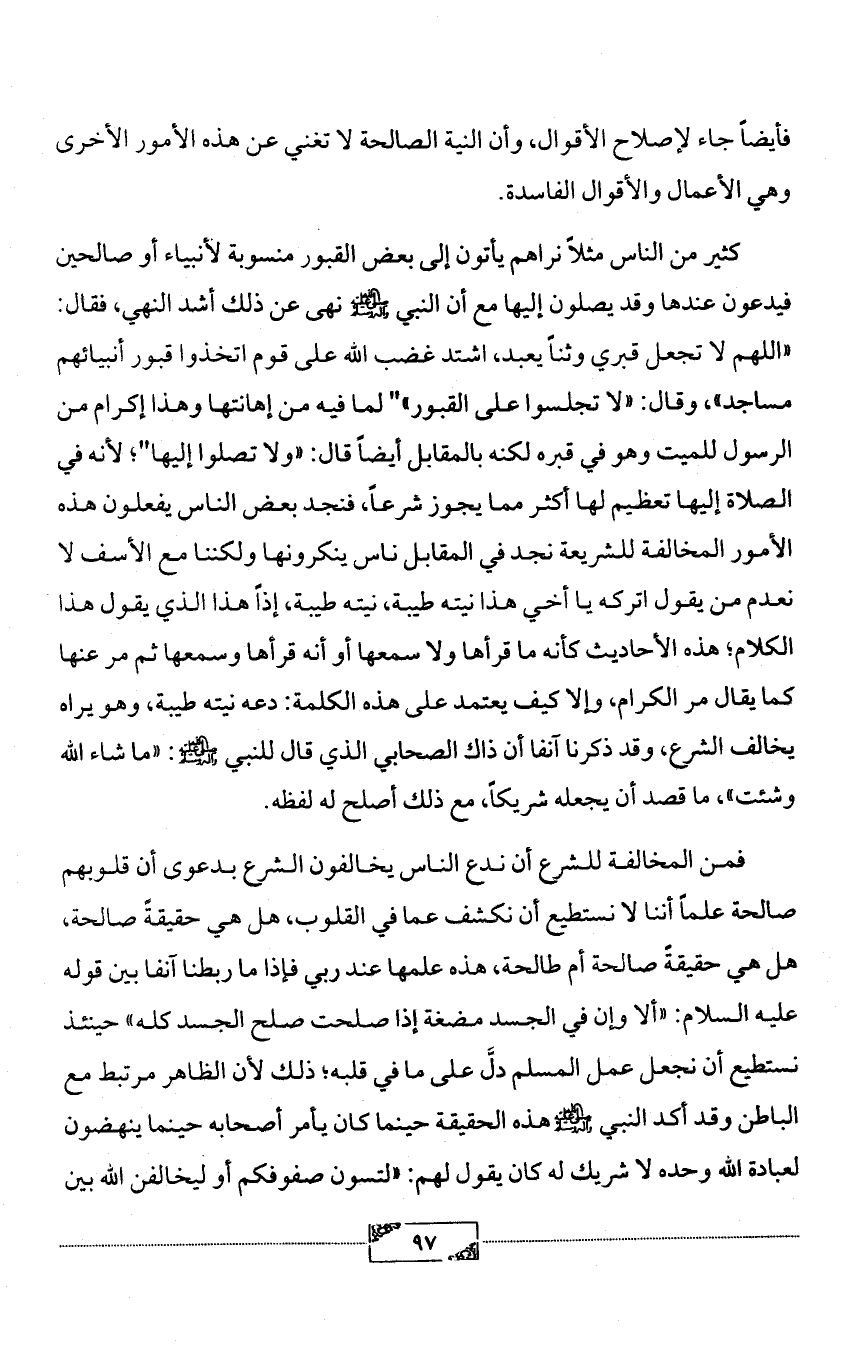 كثير من الناس مثلاً نراهم يأتون إلى بعض القبور منسوبة لأنبياء أو صالحين فيدعون عندها وقد يصلون إليها مع أن النبي - صلى الله عليه وآله وسلم - نهى عن ذلك أشد النهي، فقال: «اللهم لا تجعل قبري وثناً يعبد، اشتد غضب الله على قوم اتخذوا قبور أنبيائهم مساجد»، وقال: «لا تجلسوا على القبور» " لما فيه من إهانتها وهذا إكرام من الرسول للميت وهو في قبره لكنه بالمقابل أيضاً قال: «ولا تصلوا إليها"؛ لأنه في الصلاة إليها تعظيم لها أكثر مما يجوز شرعاً، فنجد بعض الناس يفعلون هذه الأمور المخالفة للشريعة نجد في المقابل ناس ينكرونها ولكننا مع الأسف لا نعدم من يقول اتركه يا أخي هذا نيته طيبة، نيته طيبة، إذاً هذا الذي يقول هذا الكلام؛ هذه الأحاديث كأنه ما قرأها ولا سمعها أو أنه قرأها وسمعها ثم مر عنها كما يقال مر الكرام، وإلا كيف يعتمد على هذه الكلمة: دعه نيته طيبة، وهو يراه يخالف الشرع، وقد ذكرنا آنفا أن ذاك الصحابي الذي قال للنبي - صلى الله عليه وآله وسلم -: «ما شاء الله وشئت»، ما قصد أن يجعله شريكاً، مع ذلك أصلح له لفظه.
