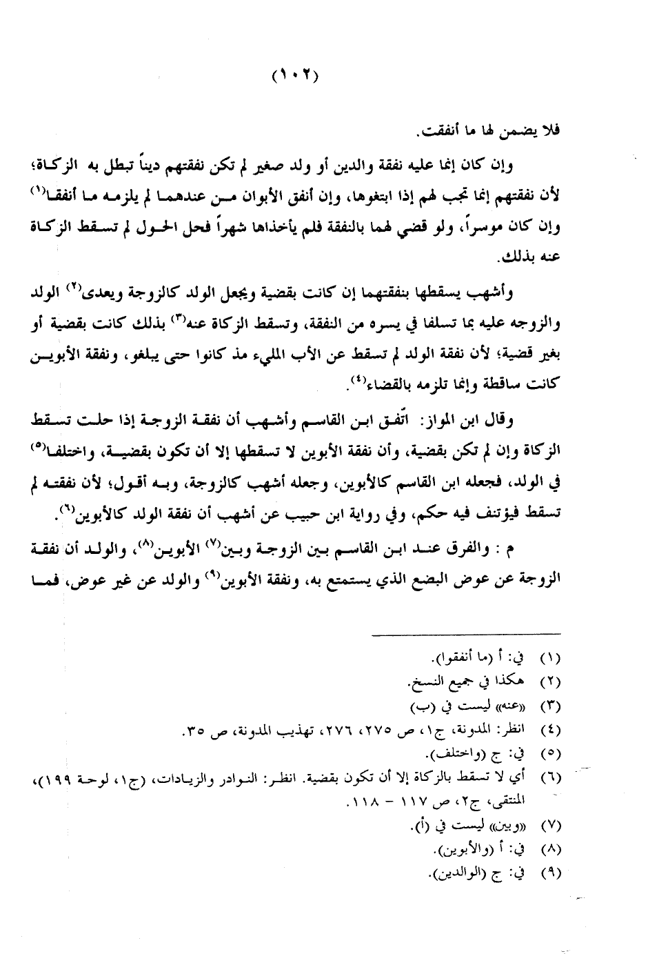 وقال ابن المواز: اتفق ابن القاسم وأشهب أن نفقة الزوجة إذا حلت تسقط الزكاة وإن لم تكن بقضية، وأن نفقة الأبوين لا تسقطها إلا أن تكون بقضية، واختلفا في الولد، فجعله ابن القاسم كالأبوين، وجعله أشهب كالزوجة، وبه أقول؛ لأن نفقته لم تسقط فيؤتنف فيه حكم، وفي رواية ابن حبيب عن أشهب أن نفقة الولد كالأبوين.