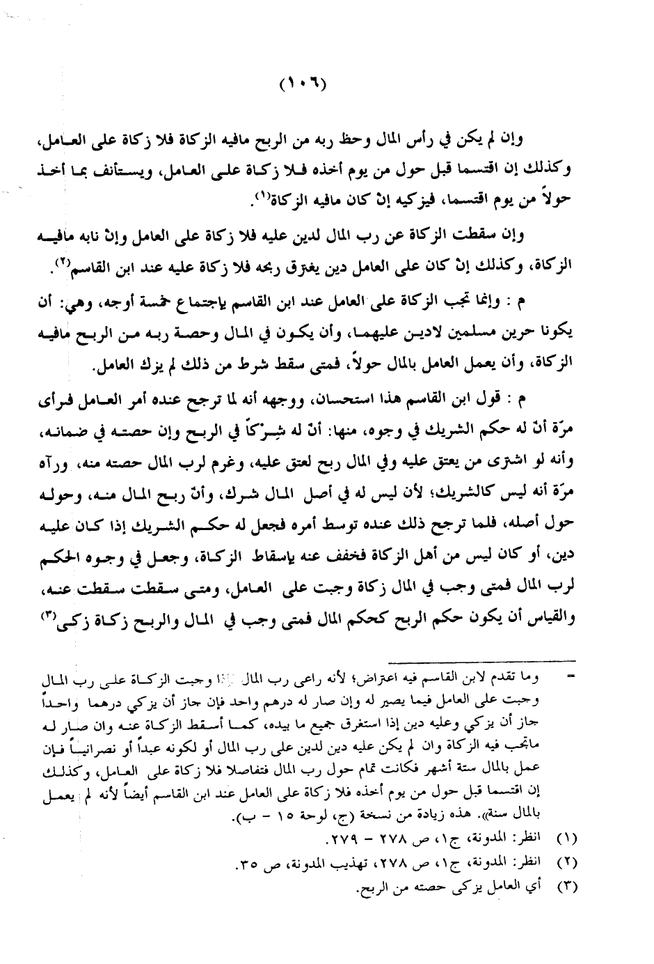 م: وإنما تجب الزكاة على العامل عند ابن القاسم باجتماع خمسة أوجه، وهي: أن يكونا حرين مسلمين لا دين عليهما، وأن يكون في المال وحصة ربه من الربح ما فيه الزكاة، وأن يعمل العامل بالمال حولا، فمتى سقط شرط من ذلك لم يزك العامل.