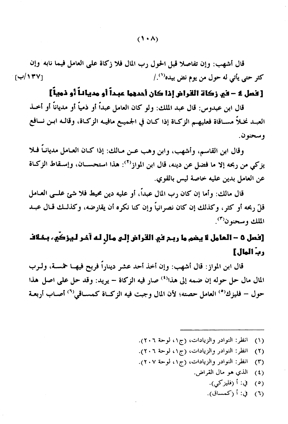 قال أشهب: وإن تفاصلا قبل الحول رب المال فلا زكاة على العامل فيما نابه وإن كثر حتى يأتي له حول من يوم نض بيده. (137/ ب).